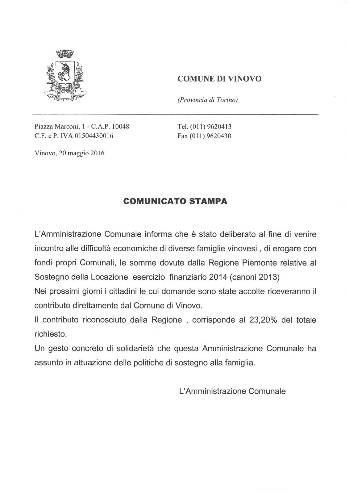 Comunicato Stampa sulla delibera di erogazione fondi Sostegno alle locazioni