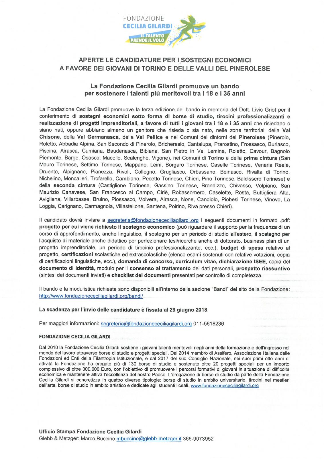 La Fondazione Cecilia Gilardi promuove la terza edizione del bando in memoria del Dott. Livio Griot per il conferimento di sostegni economici sotto forma di borse di studio, tirocini professionalizzanti e realizzazione di progetti imprenditoriali, a favore di tutti i giovani tra i 18 e i 35 anni che risiedano o siano nati, oppure abbiano almeno un genitore che risieda o sia nato, nelle zone territoriali della Val Chisone, della Val Germanasca, della Val Pellice e nei Comuni dei dintorni del Pinerolese (Pinerolo, Roletto, Abbadia Alpina, San Secondo di Pinerolo, Bricherasio, Cantalupa, Prarostino, Frossasco, Buriasco, Piscina, Airasca, Cumiana, Baudenasca, Bibiana, San Pietro in Val Lemina, Roletto, Cavour, Bagnolo Piemonte, Barge, Osasco, Macello, Scalenghe, Vigone), nei Comuni di Torino e della prima cintura (San Mauro Torinese, Settimo Torinese, Mappano, Leinì, Borgaro Torinese, Caselle Torinese, Venaria Reale, Druento, Alpignano, Pianezza, Rivoli, Collegno, Grugliasco, Orbassano, Beinasco, Rivalta di Torino, Nichelino, Moncalieri, Trofarello, Cambiano, Pecetto Torinese, Chieri, Pino Torinese, Baldissero Torinese) e della seconda cintura (Castiglione Torinese, Gassino Torinese, Brandizzo, Chivasso, Volpiano, San Maurizio Canavese, San Francesco al Campo, Ciriè, Robassomero, Caselette, Rosta, Buttigliera Alta, Avigliana, Villarbasse, Bruino, Piossasco, Volvera, Airasca, None, Candiolo, Piobesi Torinese, Vinovo, La Loggia, Carignano, Carmagnola, Villastellone, Santena, Poirino, Riva presso Chieri).