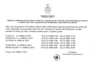 Leggi tuttoORARI APERTURA UFFICI COMUNALI IN OCCASIONE DELLE ELEZIONI DEL 26 MAGGIO 2019