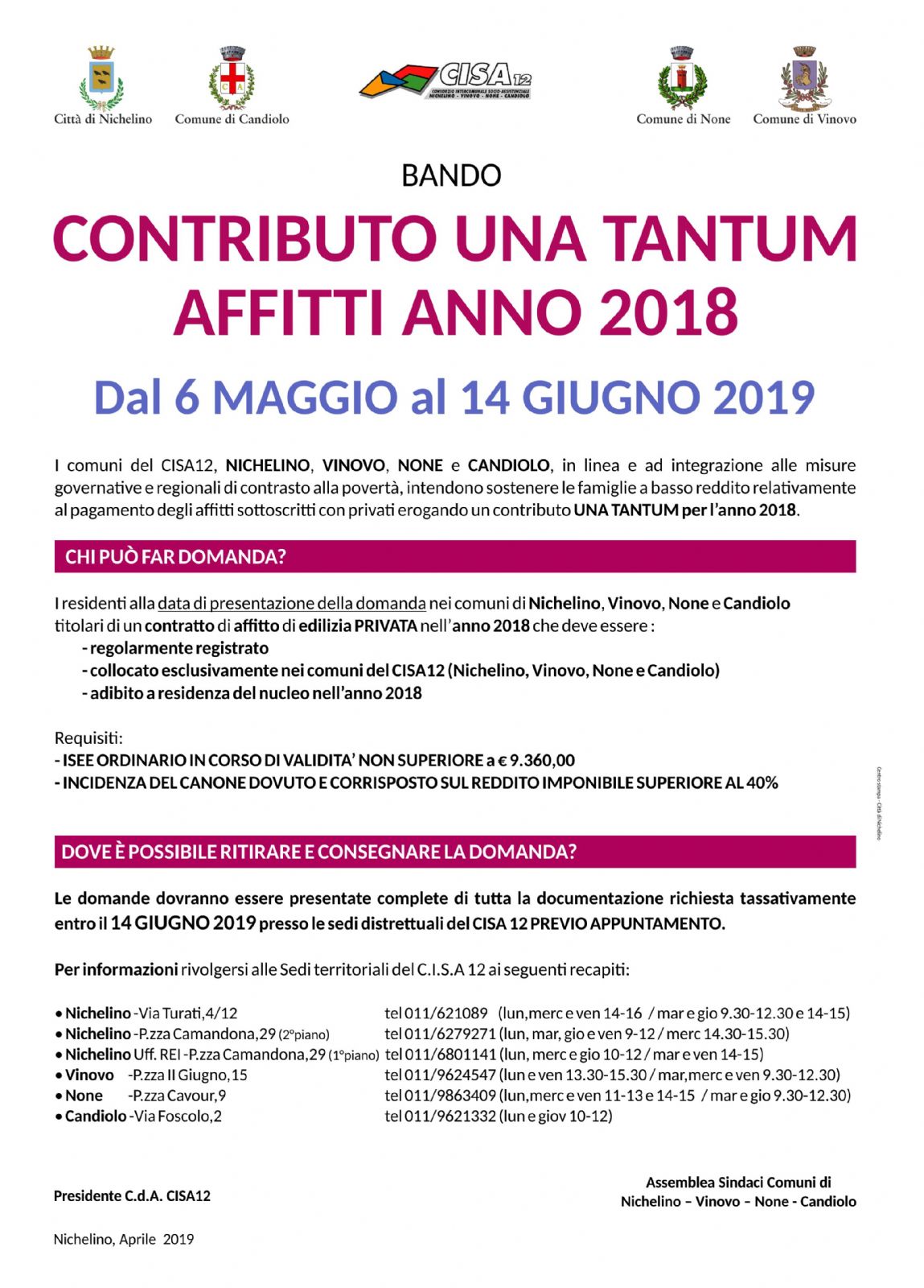 I comuni del CISA12, NICHELINO, VINOVO, NONE e CANDIOLO, in linea e ad integrazione alle misure governative e regionali di contrasto alla povertà, intendono sostenere le famiglie a basso reddito relativamente al pagamento degli affitti sottoscritti con privati erogando un contributo UNA TANTUM per l'anno 2018.