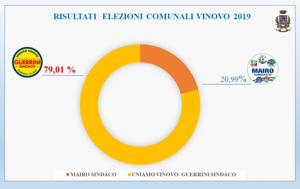 Si rende noto che, a seguito delle consultazioni per l'elezione del Sindaco del Comune di Vinovo del 26.05.2019, risulta proclamato Sindaco il Dr. GIANFRANCO GUERRINI avendo lo stesso ottenuto 6.940 voti validi pari al 79,01 % dei votanti.