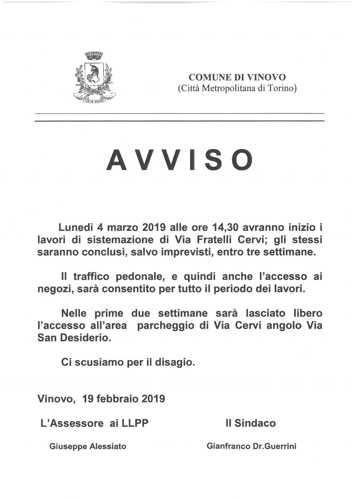 Il giorno 4 marzo avranno inizio i lavori in Via Fratelli Cervi, in allegato Avviso