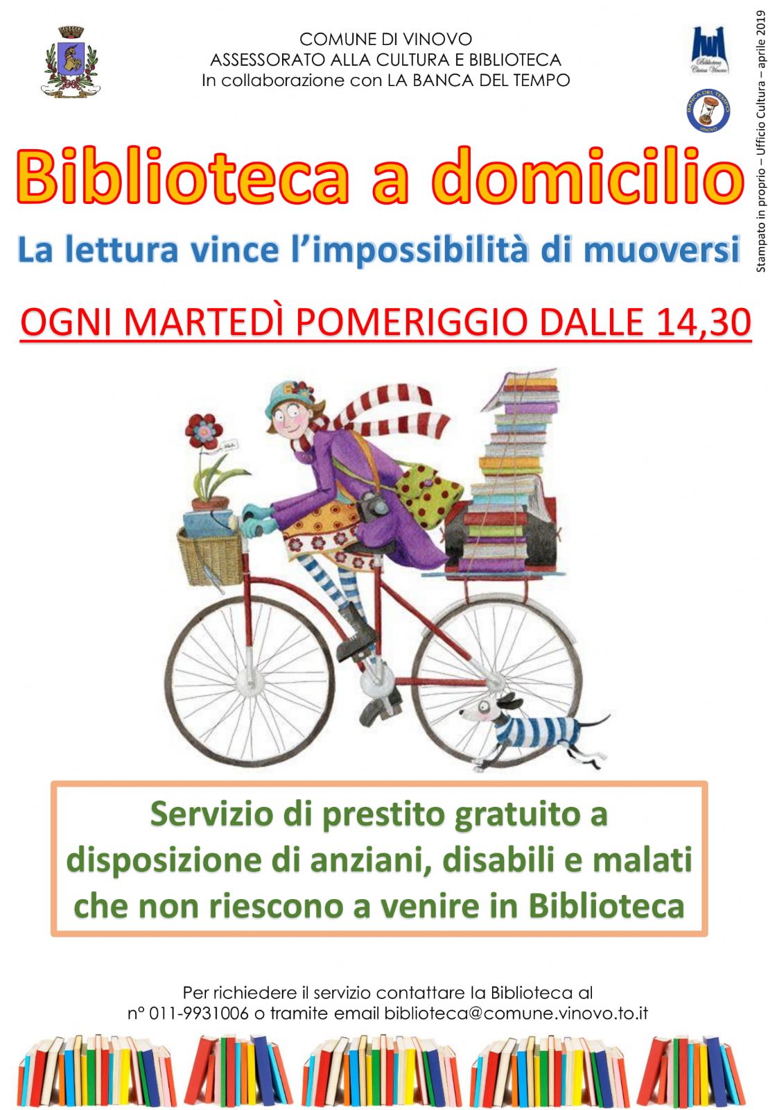 Il Comune di Vinovo in collaborazione con l'Associazione "Banca del tempo" ha attivato il servizio di prestito gratuito a domicilio a disposizione di anziani, disabili e malati che non riescono a venire in Biblioteca. Il servizio sarà reso disponibile ogni martedì pomeriggio dalle 14,30 a partire dal 09/04/2019.