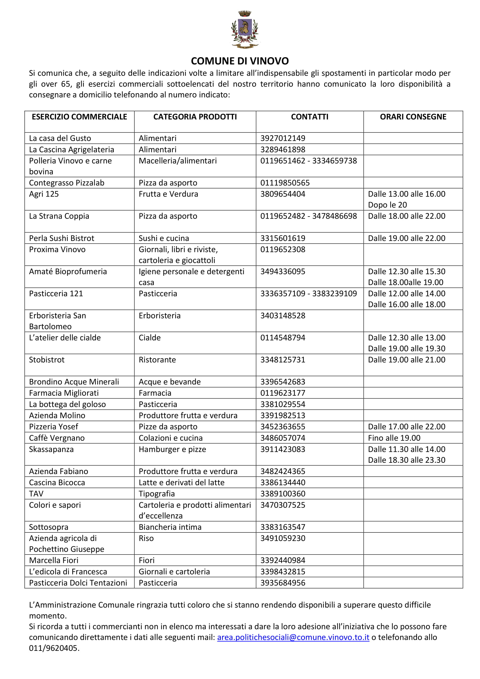 Si ricorda a tutti i commercianti non in elenco ma interessati a dare la loro adesione all’iniziativa che lo possono fare comunicando direttamente i dati alle seguenti mail: area.politichesociali@comune.vinovo.to.it o telefonando allo 011/9620405