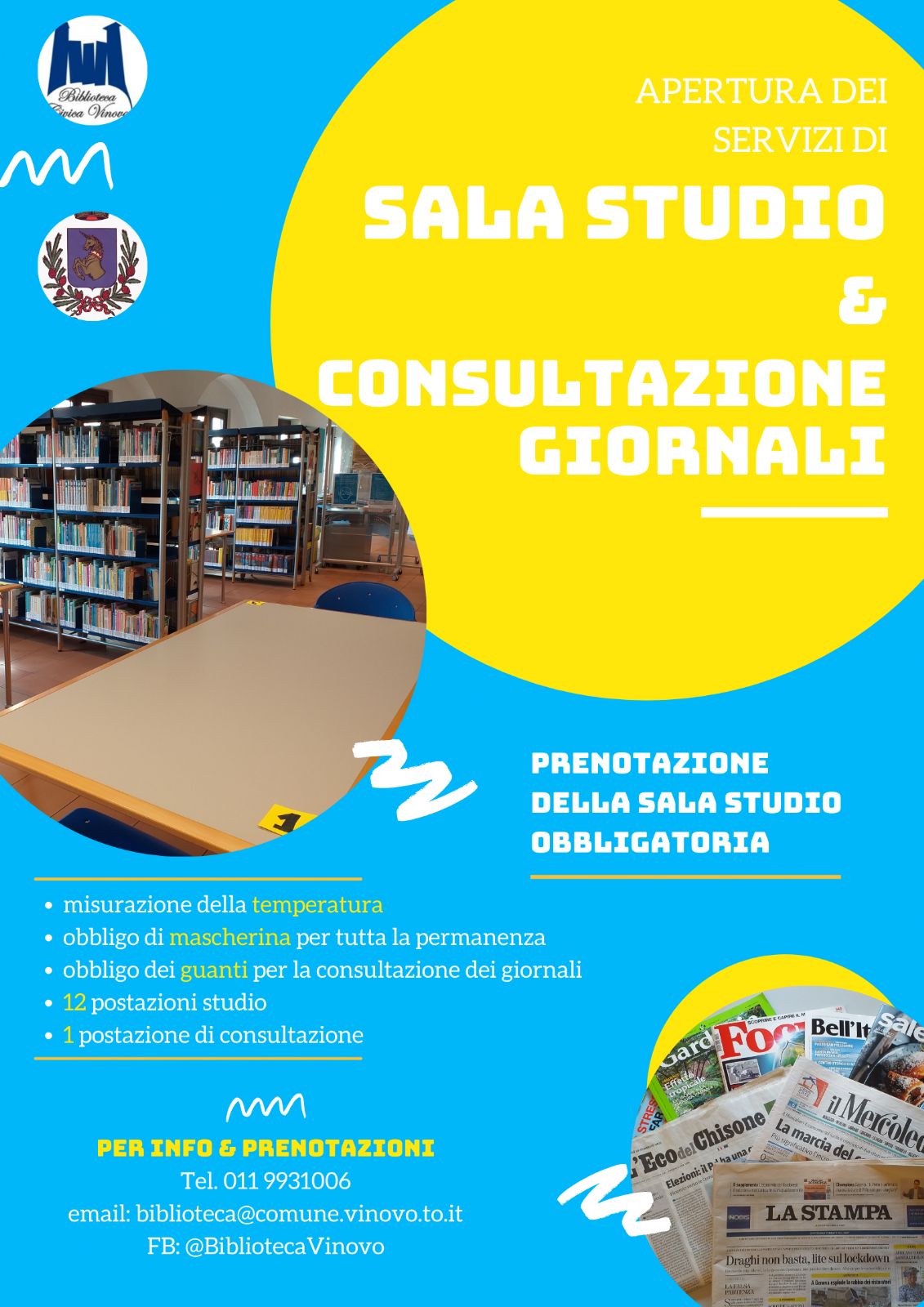 A partire da lunedì 22 febbraio 2021 sarà possibile utilizzare l'aula studio della biblioteca e consultare giornali e riviste.