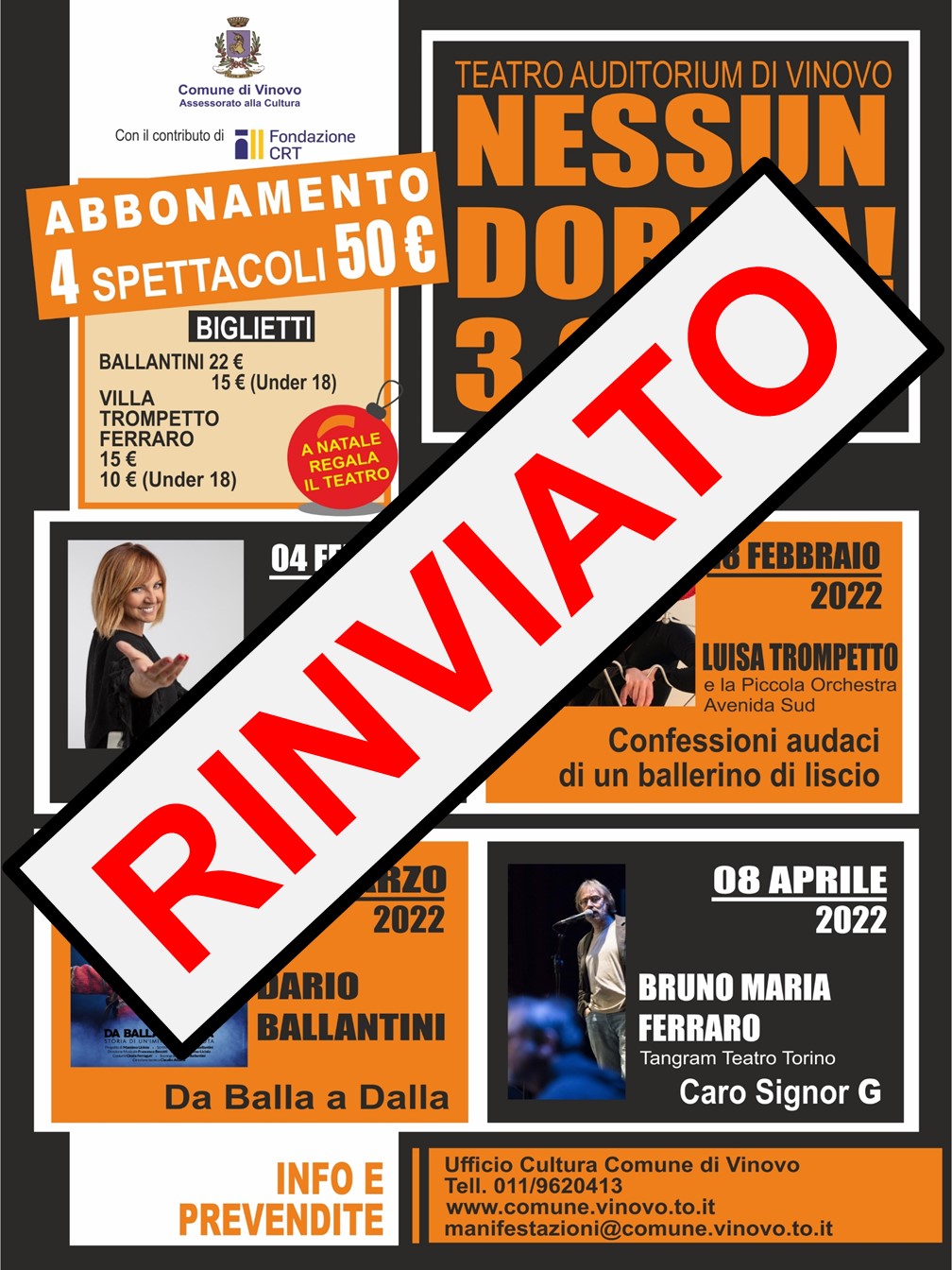Il teatro, la musica, l'arte e la cultura tutta sono strumento di reale benessere ma devono essere vissuti con serenità e leggerezza; per questo l'Amministrazione di Vinovo ha scelto di posticipare le date della nuova stagione teatrale del Comune "Nessun dorma" nella convinzione che presto si potrà ritornare a condividere questa piacevole e costruttiva opportunità.