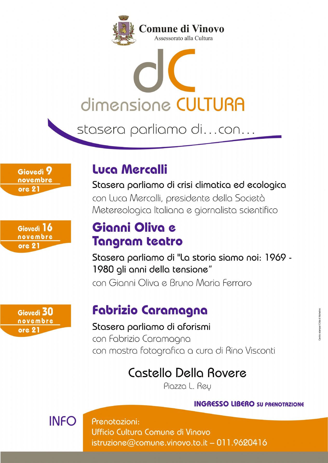 A partire da giovedì 9 novembre presso il Castello Della Rovere di Vinovo, nella suggestiva sala del Fregio, inizierà il nuovo ciclo di incontri “Dimensione Cultura“ - stasera parliamo di … con … - organizzato dall’Assessorato alla Cultura del Comune di Vinovo.