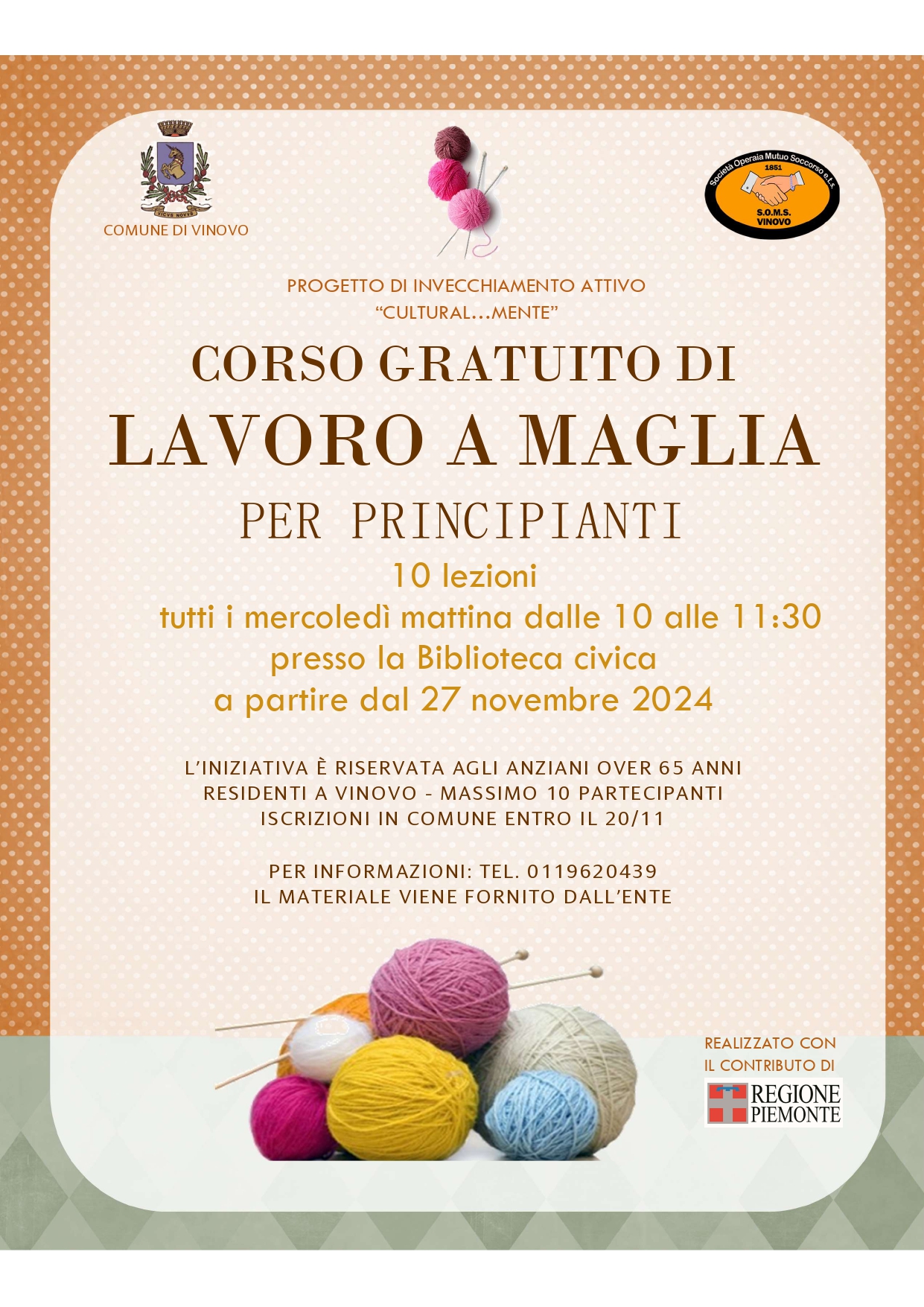 Nell'ambito del progetto di invecchiamento attivo "Cultural...mente" finanziato dalla Regione Piemonte, il Comune di Vinovo, con la collaborazione dell'Associazione Soms, organizza un corso gratuito di lavoro a maglia.
