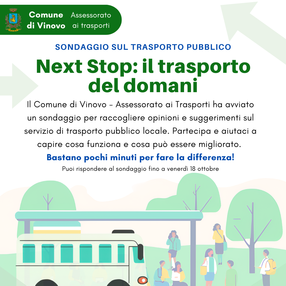 Il Comune di Vinovo - Assessorato ai Trasporti ha avviato un sondaggio per raccogliere opinioni e suggerimenti sul servizio di trasporto pubblico locale. Partecipa e aiutaci a capire cosa funziona e cosa può essere migliorato. Bastano pochi minuti per fare la differenza, il tuo parere è fondamentale!