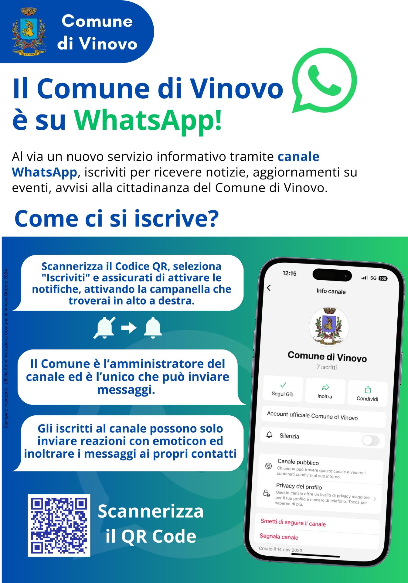 Al via un nuovo servizio informativo tramite canale WhatsApp, iscriviti per ricevere notizie, aggiornamenti su eventi, avvisi alla cittadinanza del Comune di Vinovo. Per iscriversi è sufficiente inquadrare il QRcode dell'immagine oppure cliccare sul link qui sotto.