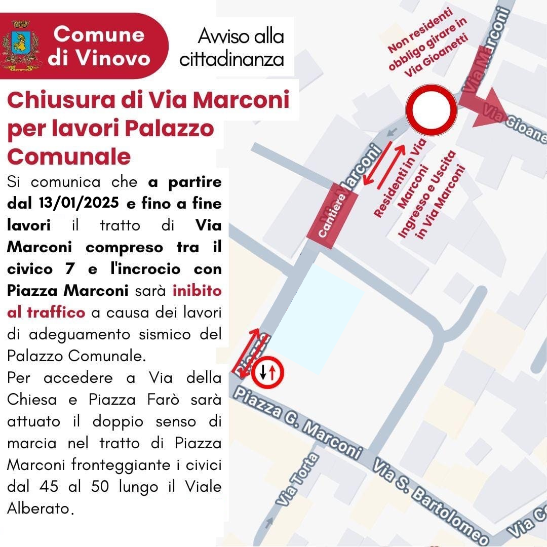 Si comunica che a partire dal 13/01/2025 e fino a fine lavori, il tratto di Via Marconi compreso tra il civico n.7 e l'incrocio con Piazza Marconi sarà inibito al traffico a causa dei lavori di adeguamento sismico del Palazzo Comunale. Per accedere a Via della Chiesa e Piazza Farò sarà attuato il doppio senso di marcia nel tratto di Piazza Marconi fronteggiante i civici dal n.45 al n.50 lungo il viale alberato.