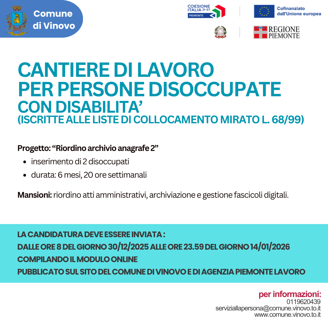 Si comunica che è stato pubblicato l'avviso pubblico di selezione per i partecipanti al nuovo progetto di cantieri di lavoro per disoccupati del Comune di Vinovo, finanziati da Regione Piemonte con fondi europei.