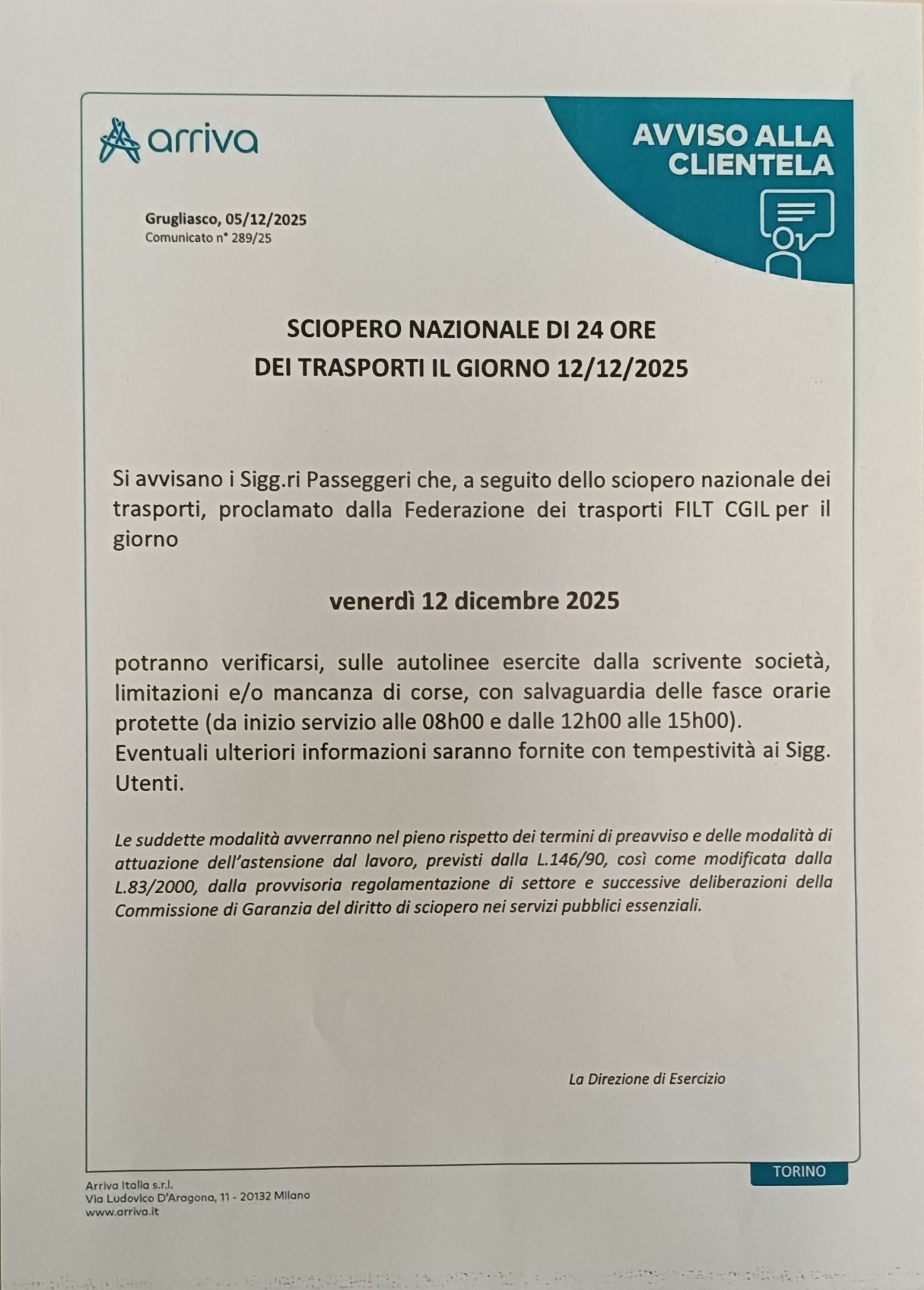 Si avvisano i Sigg.ri passeggeri che, a seguito dello sciopero nazionale dei trasporti, proclamato dalla Federazione dei trasporti FILT CGIL per il giorno venerdì 12 dicembre 2025 potranno verificarsi, sulle autolinee del trasporto pubblico, limitazioni e/o mancanza di corse, con salvaguardia delle fasce orarie protette (da inizio servizio alle 08h00 e dalle 12h00 alle 15h00).