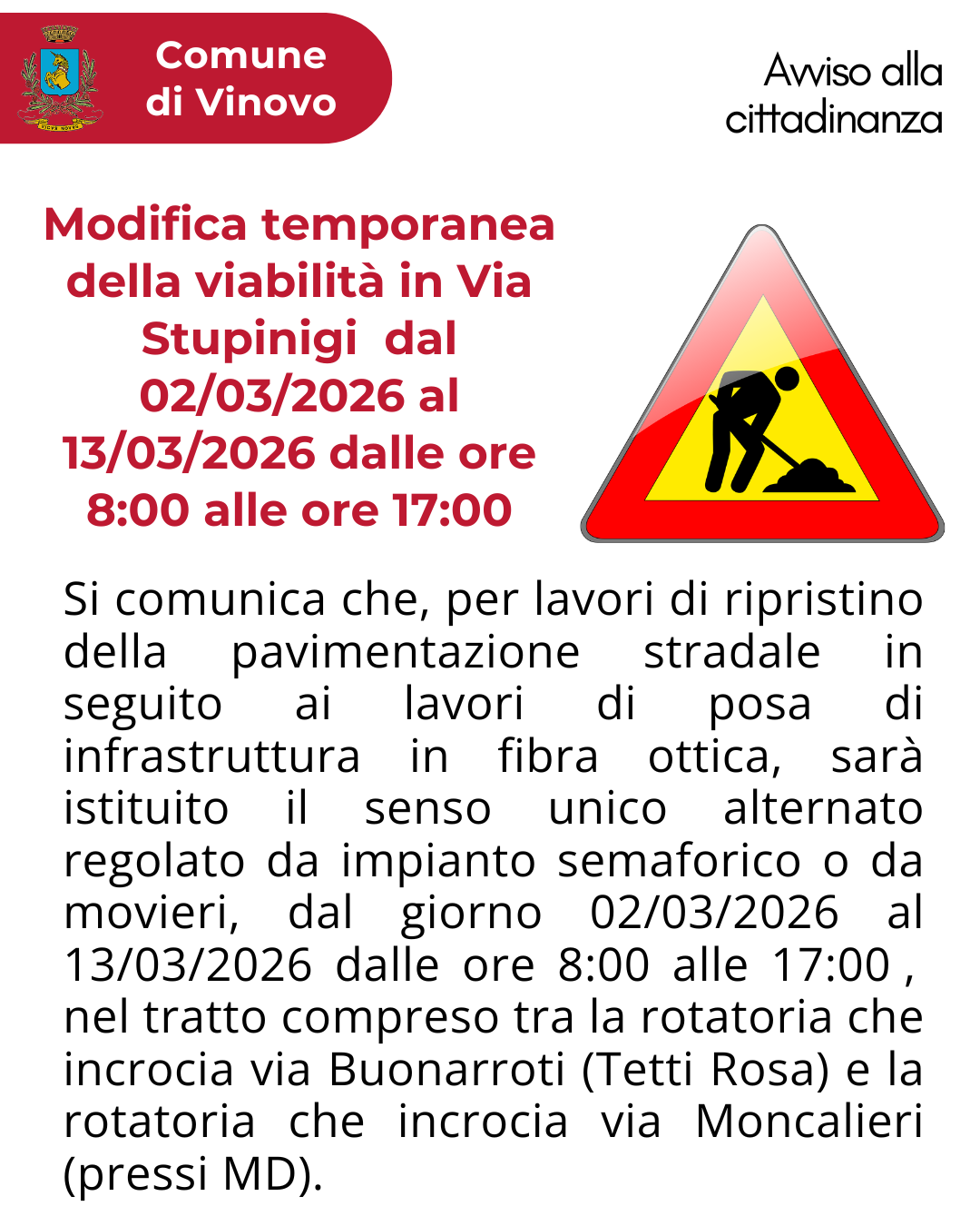 Si comunica che, per lavori di ripristino della pavimentazione stradale in seguito ai lavori di posa di infrastruttura in fibra ottica, sarà istituito il senso unico alternato regolato da impianto semaforico o da movieri, dal giorno 02/03/2026 al 13/03/2026 dalle ore 8:00 alle 17:00 , nel tratto compreso tra la rotatoria che incrocia via Buonarroti (Tetti Rosa) e la rotatoria che incrocia via Moncalieri (pressi MD).