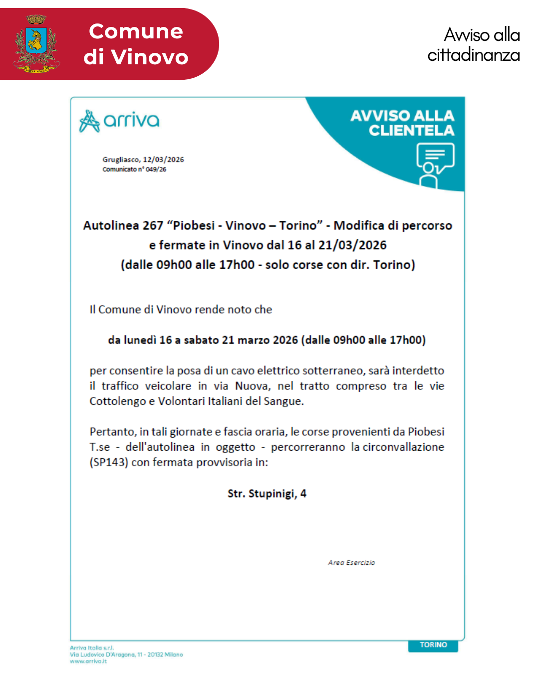 Si comunica che dal 16/03/2026 al 21/03/2026 per l'esecuzione di lavori di posa di un cavo elettrico sotterraneo, sarà interdetto il traffico veicolare in via Nuova, nel tratto compreso tra le vie Cottolengo e Volontari Italiani del Sangue. Pertanto, la Società Arriva Italia comunica che in tale periodo, le corse provenienti da Piobesi T.se - dell'autolinea in oggetto - percorreranno la circonvallazione(SP143) con fermata provvisoria in Via Stupinigi n.4.