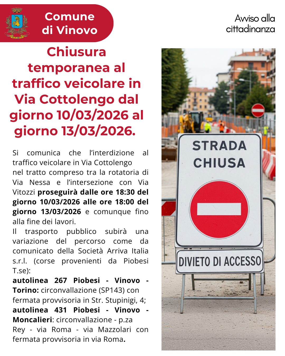 Si comunica che l’interdizione al traffico veicolare in Via Cottolengo nel tratto compreso tra la rotatoria di Via Nessa e l’intersezione con Via Vitozzi proseguirà dalle ore 18:30 del giorno 10/03/2026 alle ore 18:00 del giorno 13/03/2026 e comunque fino alla fine dei lavori.