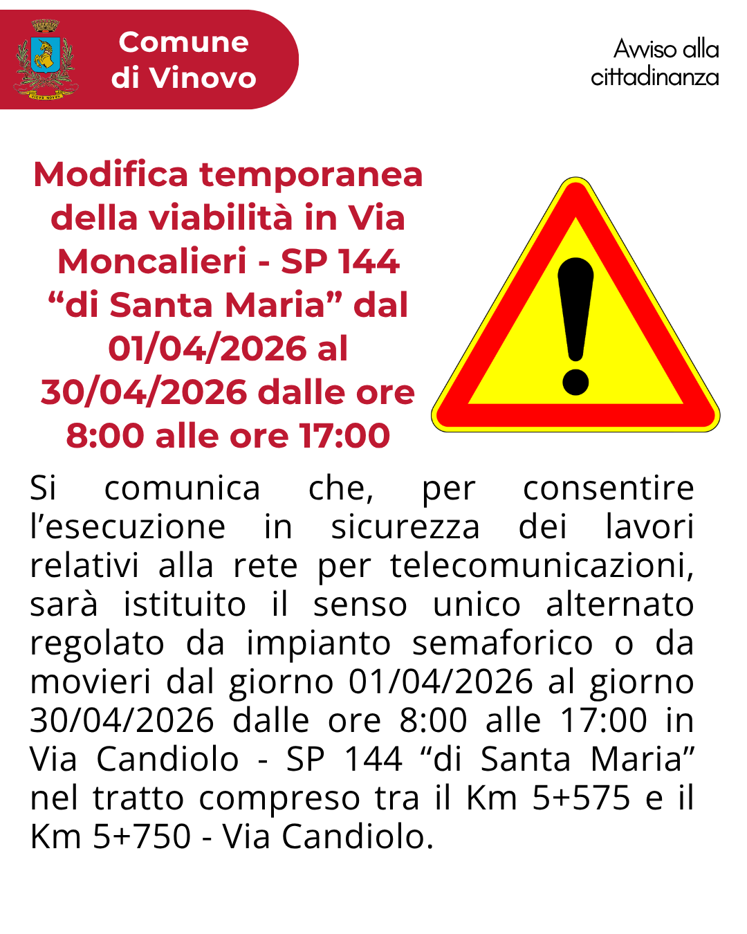 Si comunica che, per consentire l’esecuzione in sicurezza dei lavori relativi alla rete per telecomunicazioni, sarà istituito il senso unico alternato regolato da impianto semaforico o da movieri dal giorno 01/04/2026 al giorno 30/04/2026 dalle ore 8:00 alle 17:00 in Via Candiolo - SP 144 “di Santa Maria” nel tratto compreso tra il Km 5+575 e il Km 5+750 - Via Candiolo.