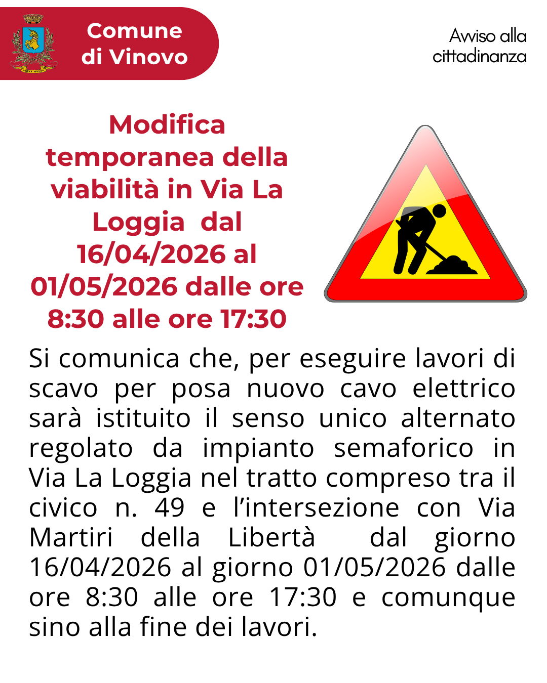 Si comunica che, per eseguire lavori di scavo per posa nuovo cavo elettrico sarà istituito il senso unico alternato regolato da impianto semaforico in Via La Loggia nel tratto compreso tra il civico n. 49 e l’intersezione con Via Martiri della Libertà dal giorno 16/04/2026 al giorno 01/05/2026 dalle ore 8:30 alle ore 17:30 e comunque sino alla fine dei lavori.