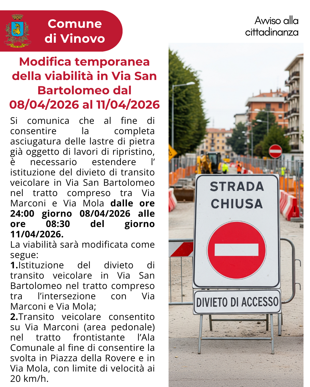 Si comunica che al fine di consentire la completa asciugatura delle lastre di pietra già oggetto di lavori di ripristino, è necessario estendere l’ istituzione del divieto di transito veicolare in Via San Bartolomeo nel tratto compreso tra Via Marconi e Via Mola dalle ore 24:00 giorno 08/04/2026 alle ore 08:30 del giorno 11/04/2026.