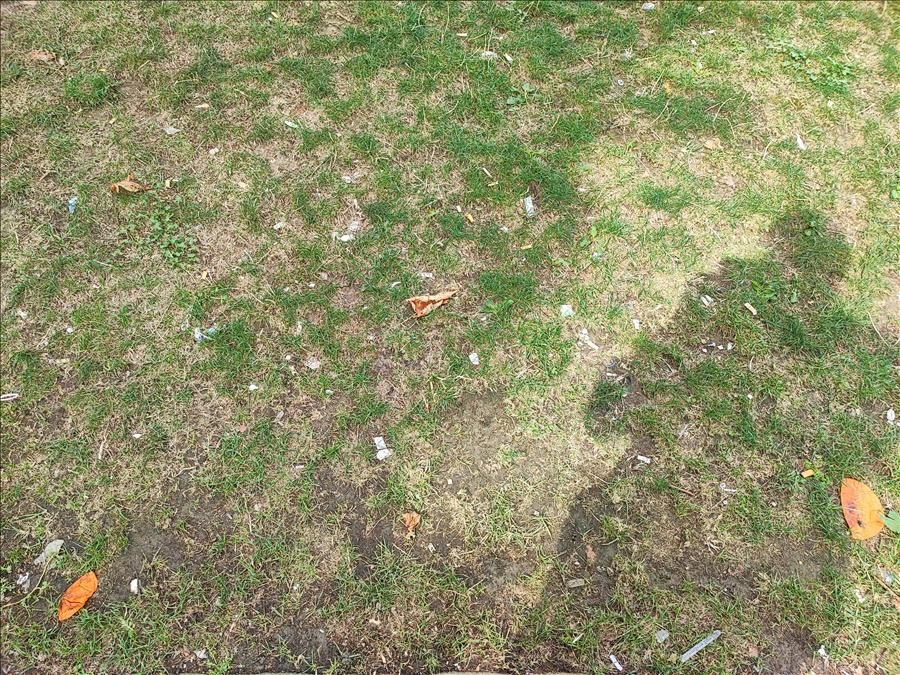 Presenza di immondizia nell'area giochi, nel manto erboso e nella zona pacciamata limitrofa, adibita a parcheggio veicolare: mozziconi di sigaretta, tappi plastici,tappi metallici,cellophane di pacchetti di sigarette, brandelli di palloncini plastici, involucri di caramelle, lattine in alluminio,cartoncini,...per citarne alcuni.