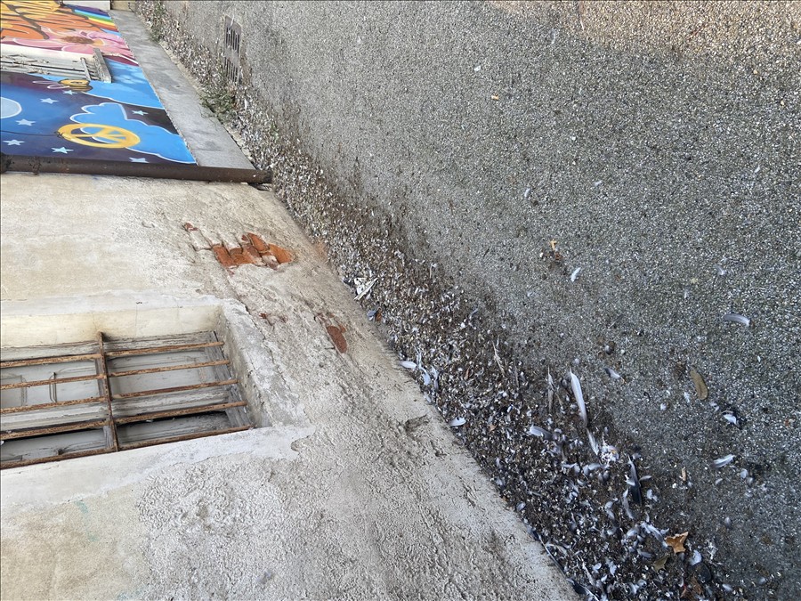 In via De Amicis di fronte alla scuola elementare uno spesso strato di guano di piccione sul bordo della strada.