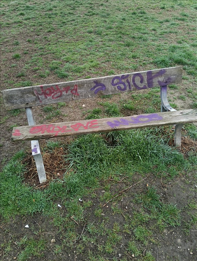 Vandali che rovinano le panchine (che sono fatte per sedersi), fontana non funzionante e rotta (tra poco arriverà la bella stagione, e già il pomeriggio le temperature arrivano a 16 gradi, per cui i cani hanno sete)