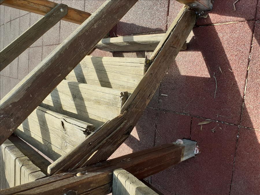 Nell'area giochi del giardino in Via Garibaldi, la scaletta dello scivolo sta per cedere.
