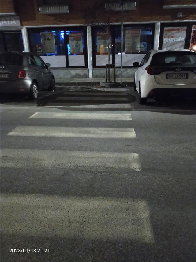 Buongiorno, segnalo che le strisce pedonali poste di fronte al negozio il mio gigante in via Cottolengo 76 sono scarsamente illuminate ed in più non sono a norma perché non consentono la discesa/salita di persone in carrozzina o passeggino dal/sul marciapiede.