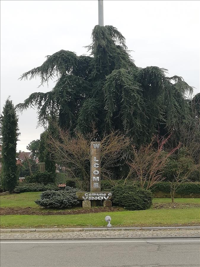 alla stele della rotonda dei cavalieri sono cadute la lettera E di WELCOME e la lettera O di VINOVO.
