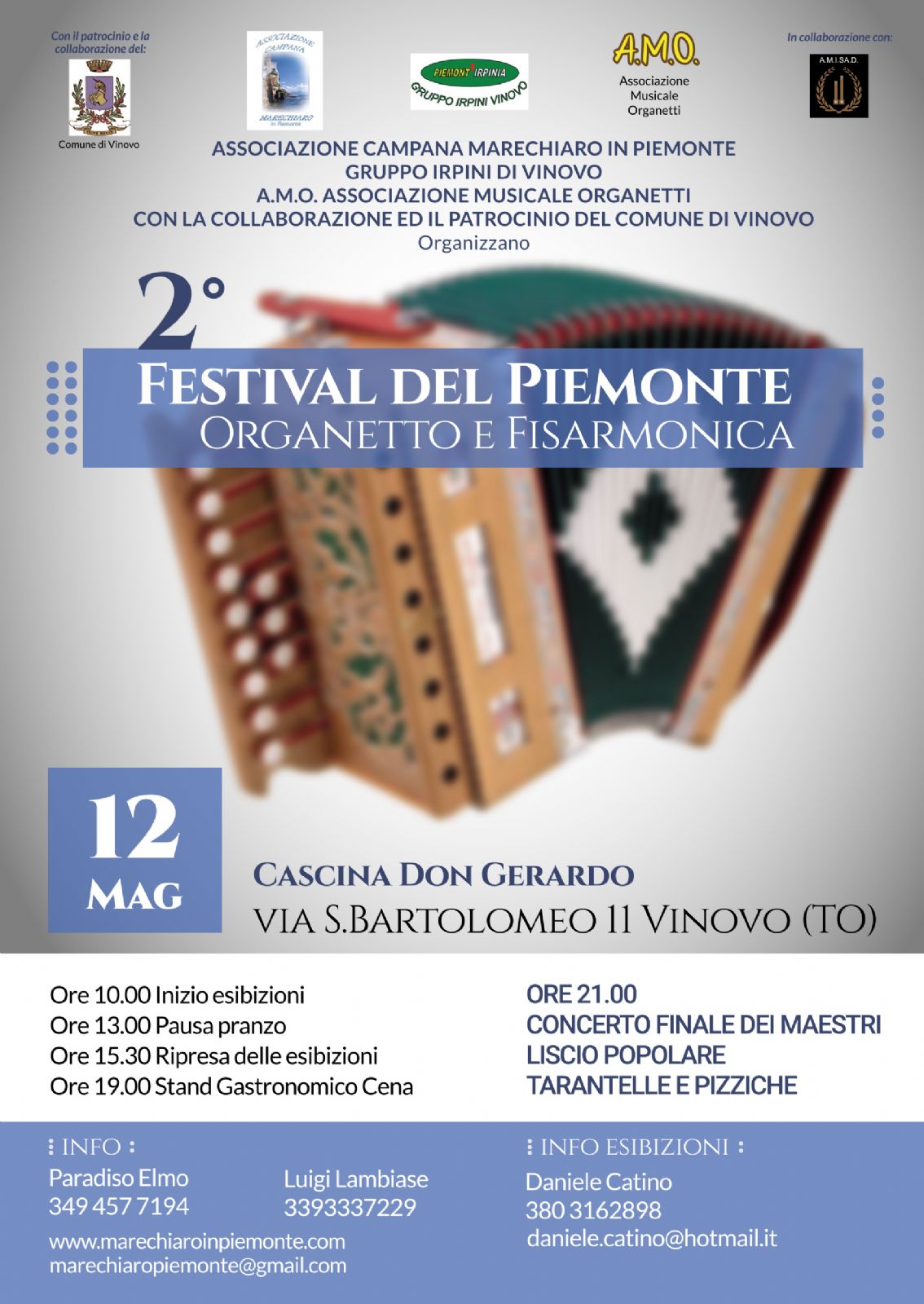 Il 12 maggio l’Associazione Campana Marechiaro in Piemonte-Gruppo Irpini di Vinovo in collaborazione con l’Amministrazione Comunale e A.M.O. (associazione musicale Organetti) organizza il 2° Festival del Piemonte di Organetti e Fisarmonica.