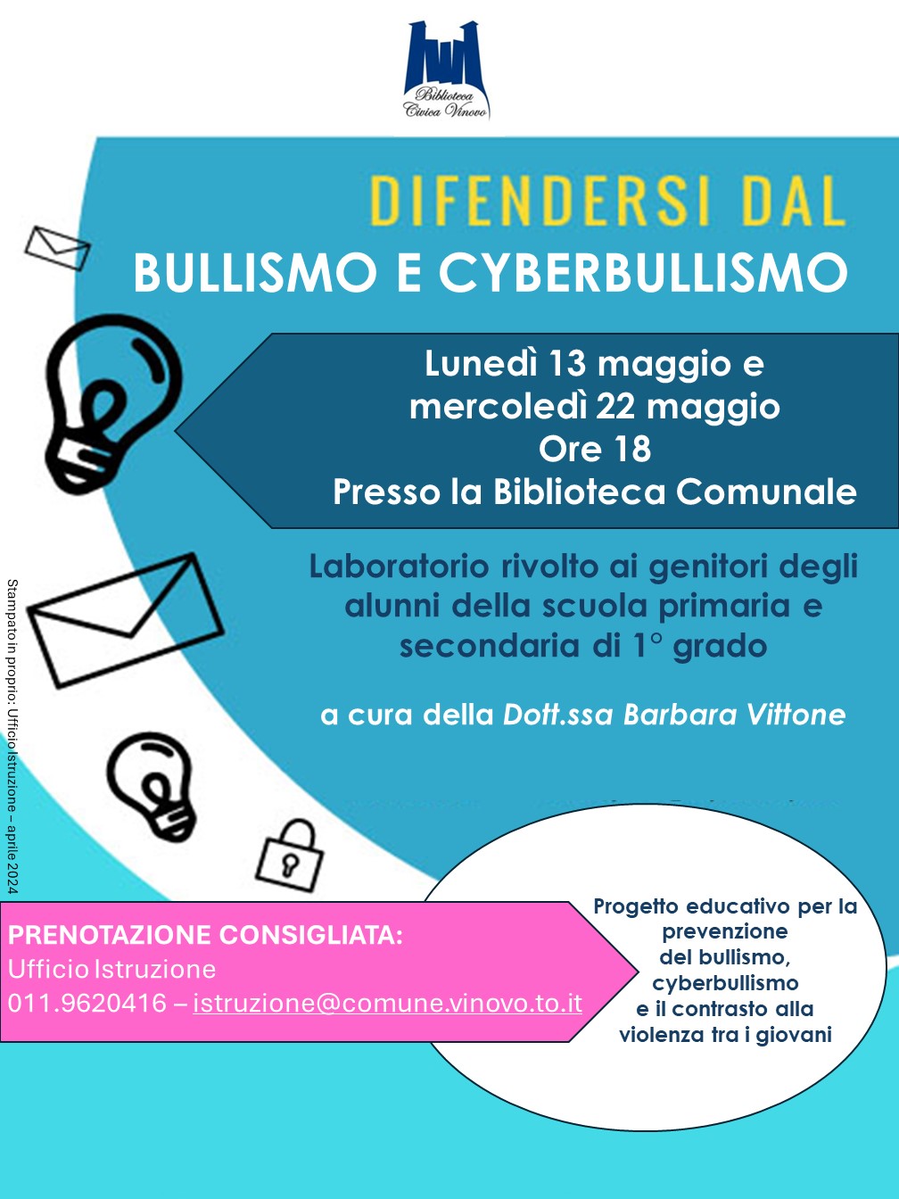 Lunedì 13 maggio e mercoledì 22 maggio si terranno due incontri rivolti ai genitori degli alunni della scuola primaria e secondaria sul bullismo e cyberbullismoa cura della Dott.ssa Barbara Vittone.