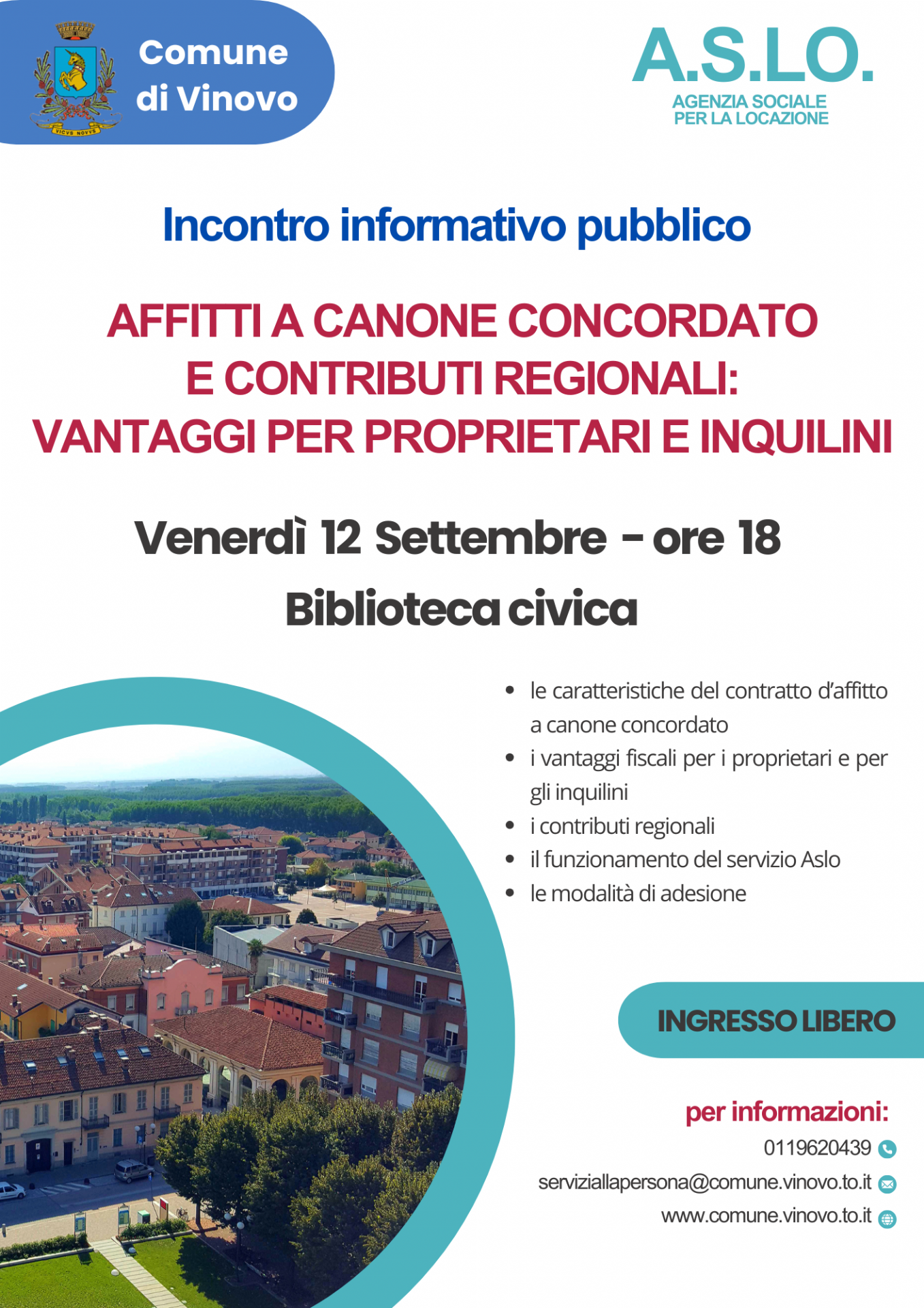 Il Comune di Vinovo organizza un incontro informativo pubblico rivolto a cittadini, proprietari di immobili, inquilini e professionisti del settore per far conoscere e approfondire le opportunità legate ai contratti di locazione a canone concordato e ai contributi regionali a sostegno dell’affitto.