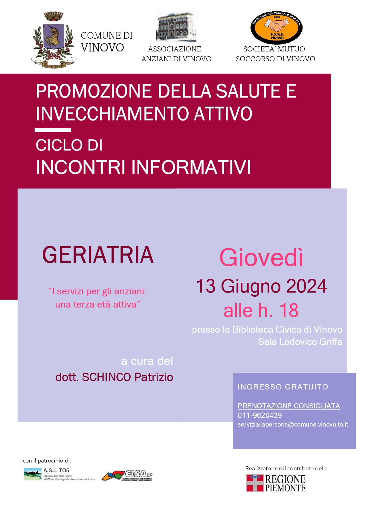 Giovedì 13 Giugno 2024 alle ore 18, presso la Biblioteca Civica di Vinovo, si svolgerà il quinto incontro informativo sulla promozione della salute e invecchiamento attivo.
