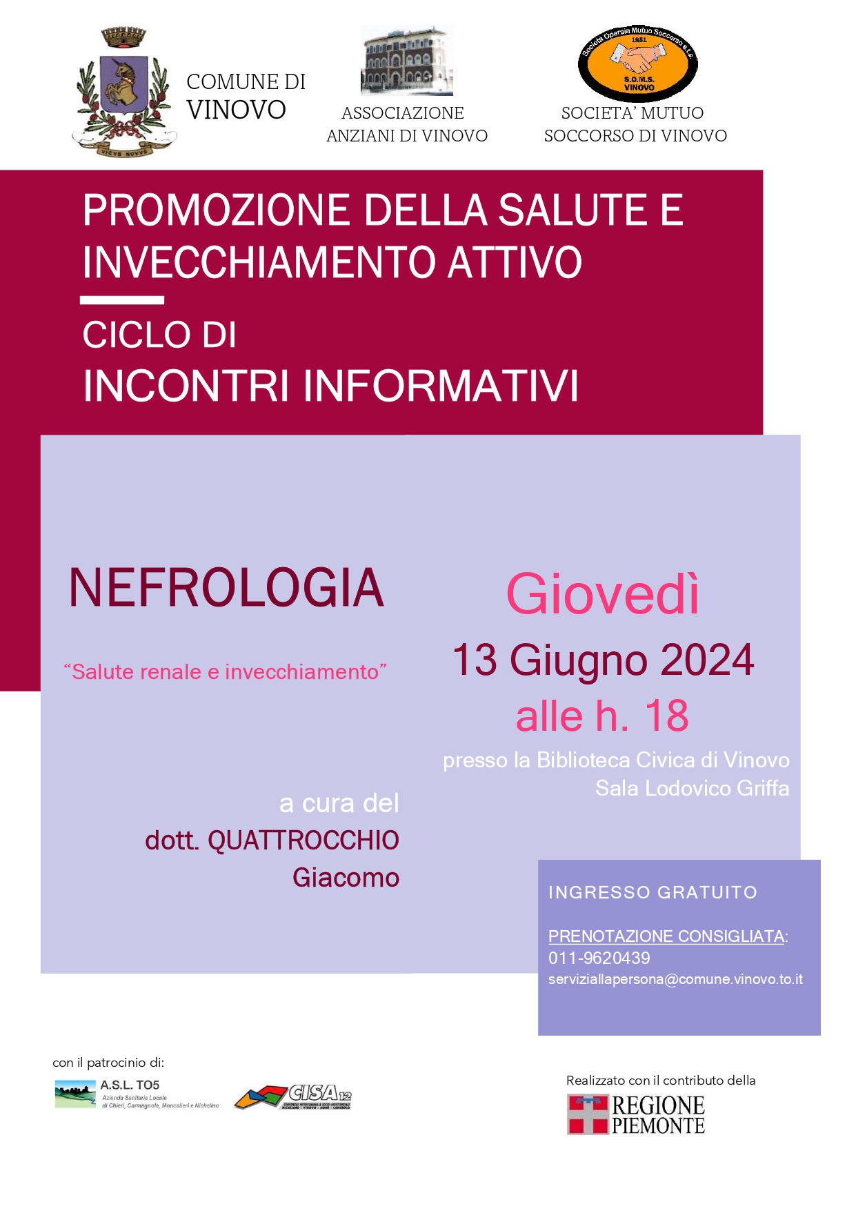 GIOVEDI' 13 Giugno 2024 h 18: NEFROLOGIA - "Salute renale e invecchiamento" a cura del dott. Giacomo Quattrocchio