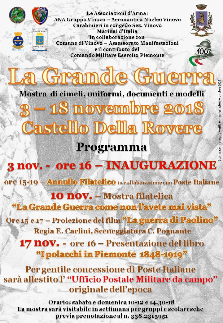 Le Associazioni d'Arma del territorio in collaborazione con il Comune di Vinovo e con il contributo del Comando militare Esercito Piemonte organizza una mostra di cimeli, uniformi, documenti e modelli in occasione del Centenario della Fine della Prima Guerra Mondiale.