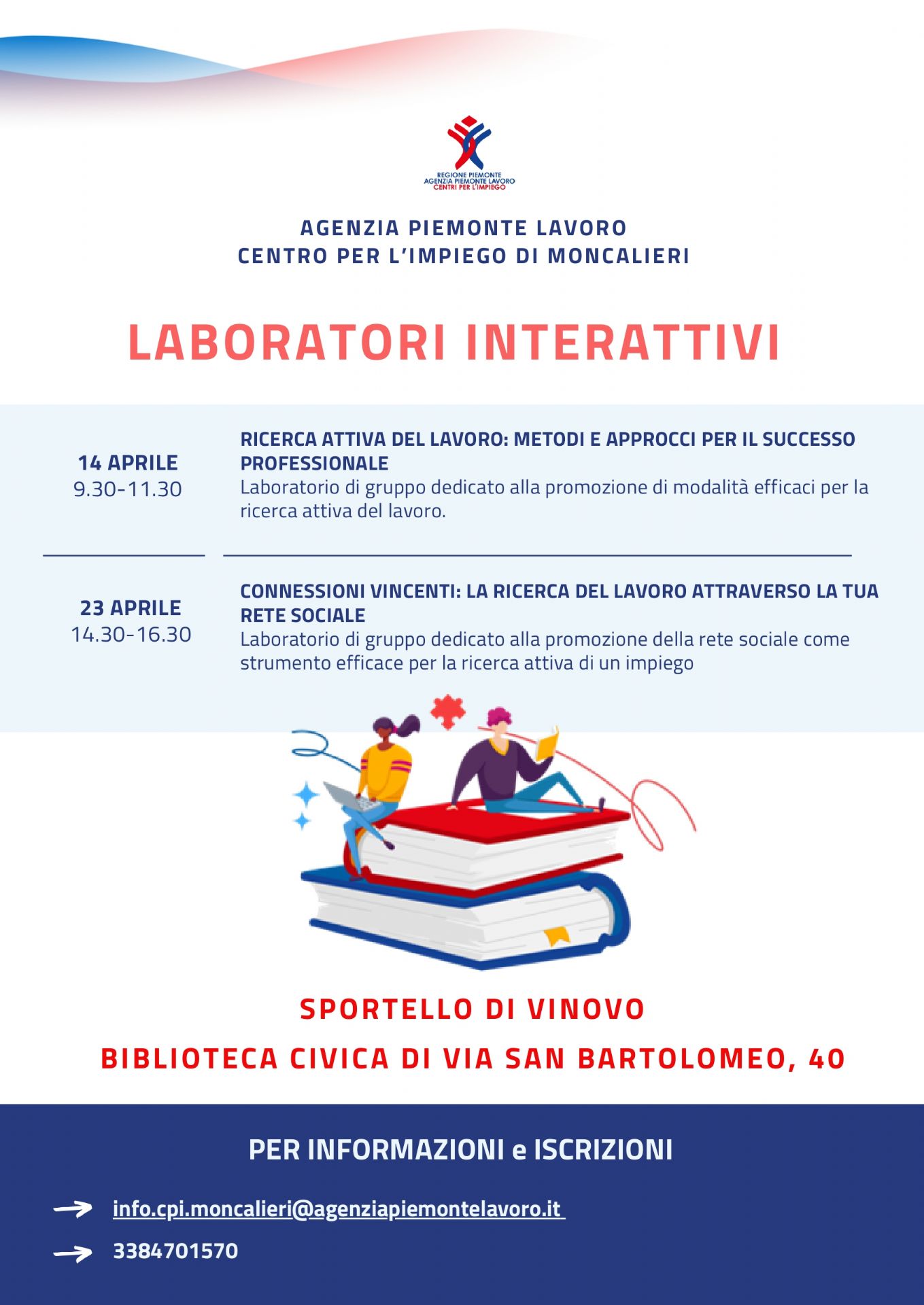 - 23 aprile dalle 14.30 alle 16.30: connessioni vincenti: la ricerca del lavoro attraverso la tua rete sociale. Laboratorio di gruppo dedicato alla promozione della rete sociale come strumento efficace per la ricerca attiva di un impiego.