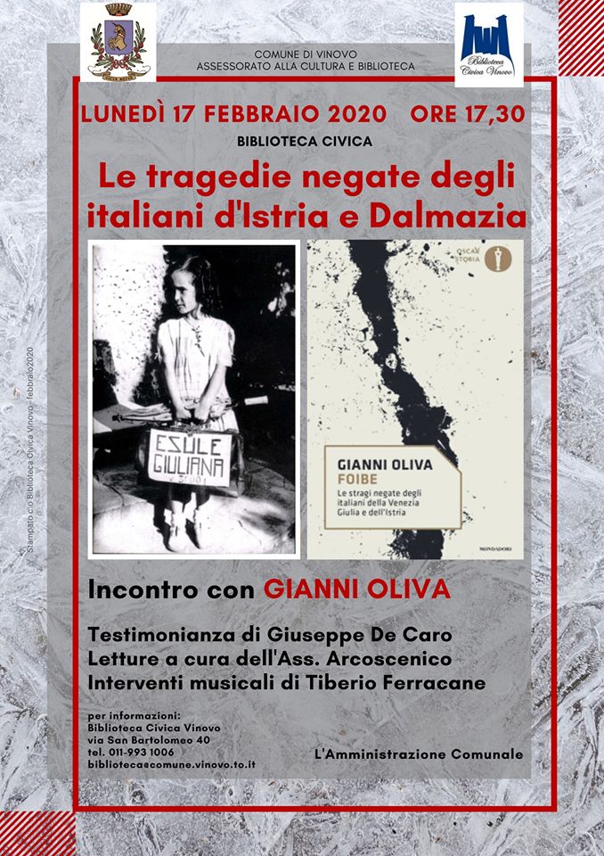 In occasione del Giorno del Ricordo, il Comune di Vinovo ha organizzato l'incontro "Le tragedie negate degli italiani d'Istra e Dalmazia" con Gianni Oliva.