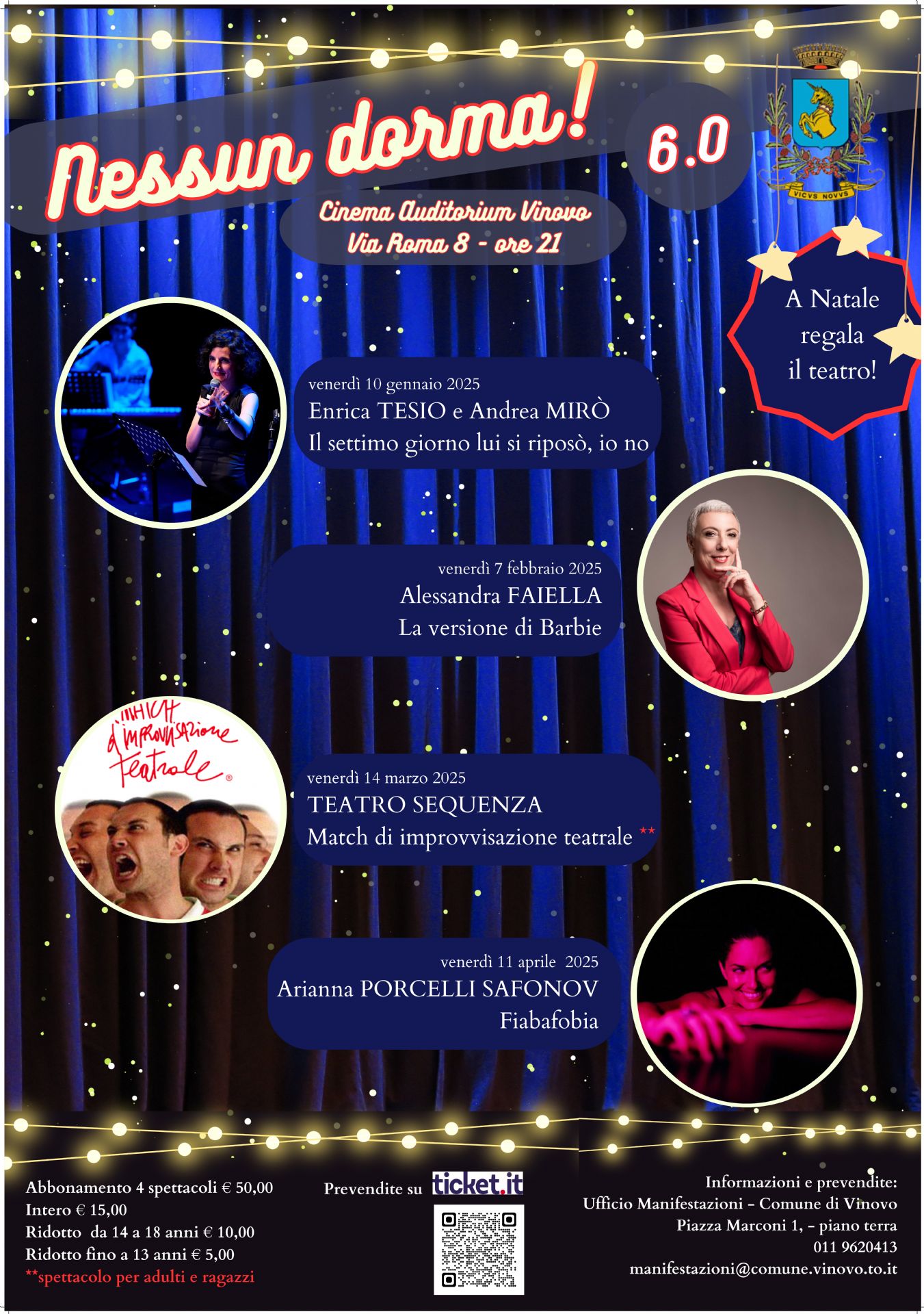Le proposte per il 2025 sono particolarmente variegate: con spettacoli che vanno dal monologo alla stand up comedy passando per il match di improvvisazione teatrale, il cartellone di Nessun dorma! 2025 offre al pubblico spettacoli e atmosfere più eterogenei, con l’intento di andare incontro ai gusti di fasce di pubblico potenzialmente più ampie, anche a livello anagrafico.