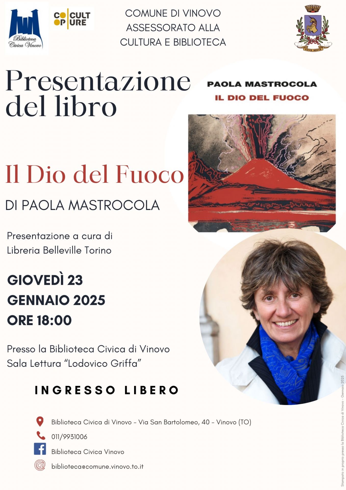 Giovedì 23 Gennaio alle ore 18:00 Paola Mastrocola presenta il suo libro "Il Dio del Fuoco". L'evento si terrà presso la Biblioteca Civica di Vinovo, sala lettura "Ludovico Griffa".