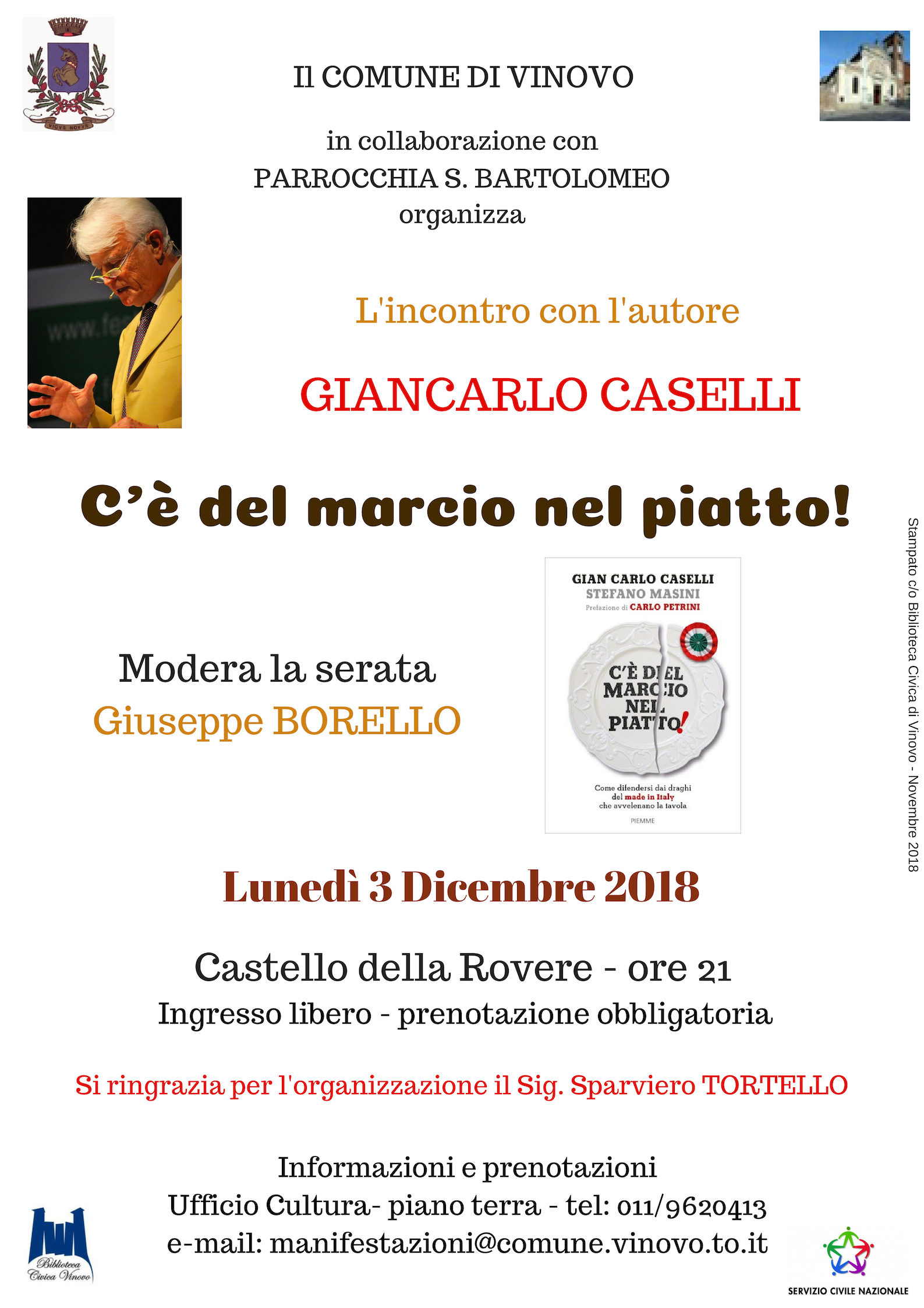 Lunedì 3 dicembre 2018 alle ore 21.00 nel Salone degli Affreschi del Castello Della Rovere Giancarlo Caselli presenta il suo libro "C'è del marcio nel piatto".