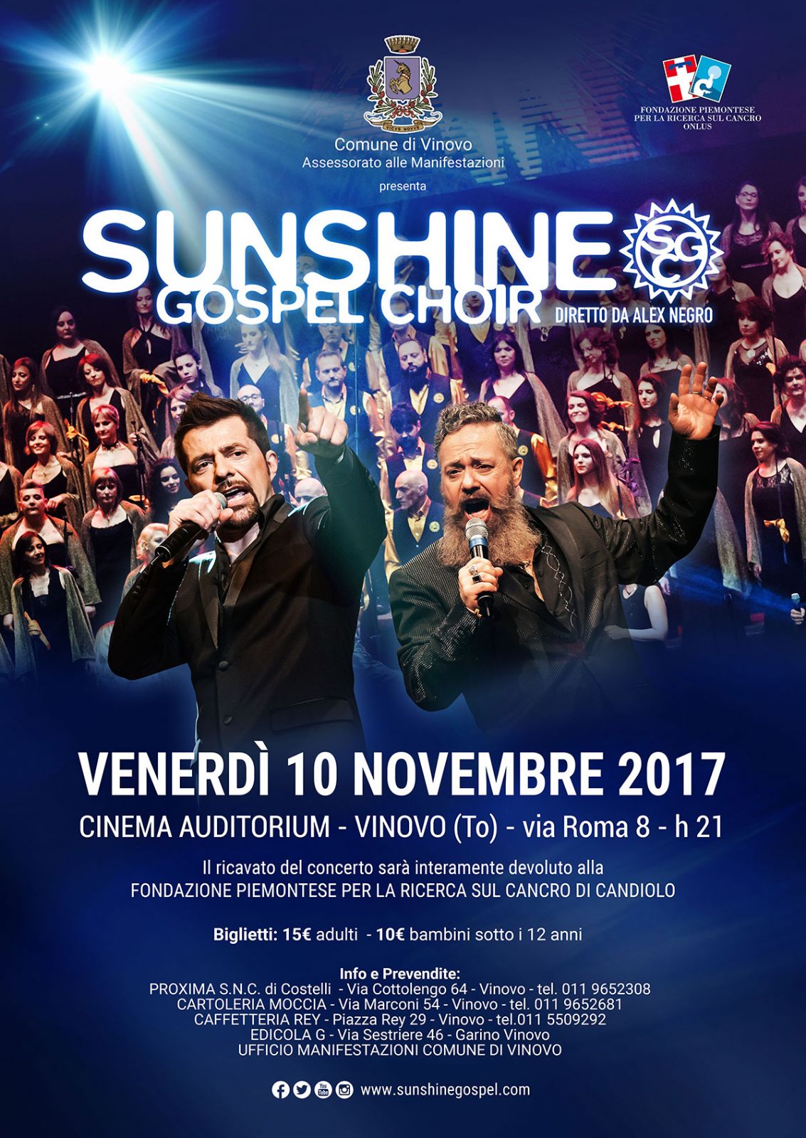 Il Comune di Vinovo organizza una serata di beneficenza a favore della Fondazione Piemontese per la Ricerca sul Cancro con uno spettacolo del "Sunshine Gospel Choir" presso il Cinema Auditorium Vinovo.