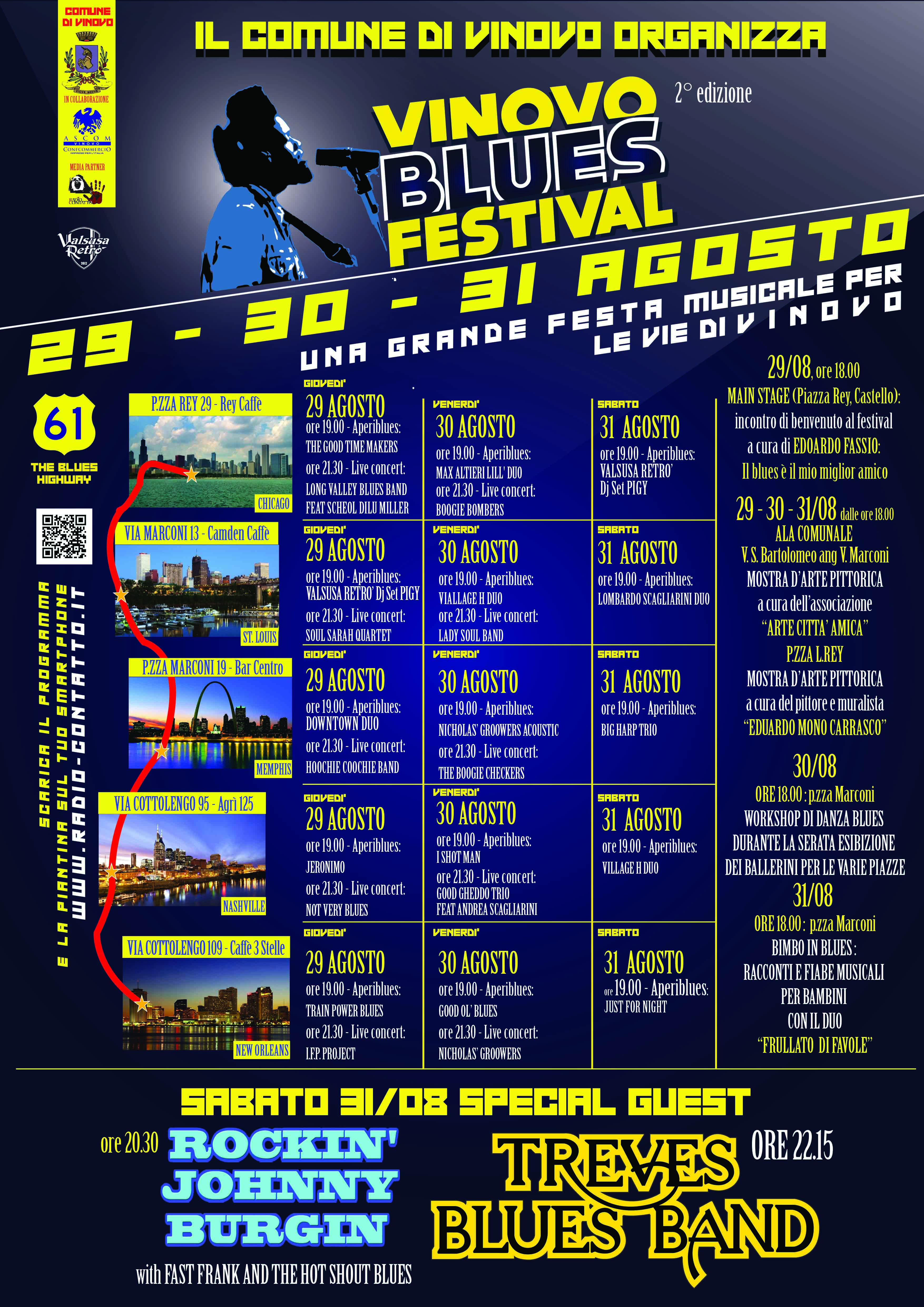 Il percorso sonoro suggerito dal cartellone della manifestazione - organizzata dal Comune di Vinovo e Ascom Vinovo, media partner Radio Contatto, la web radio di Vinovo - è un crescendo che culmina negli eventi del sabato sera con due headliner di statura mondiale: il chitarrista e armonicista di Chicago Rockin’ Johnny Burgin e la Treves Blues Band che calca i palchi nazionali ed internazionali dal 1974