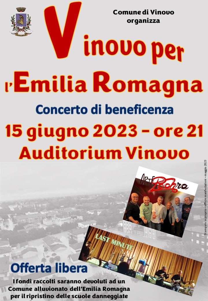 La Cittadinanza è invitata a partecipare al concerto di beneficenza a favore dell'Emilia Romagna che si terrà in Auditorium il 15 Giugno alle ore 21.00.