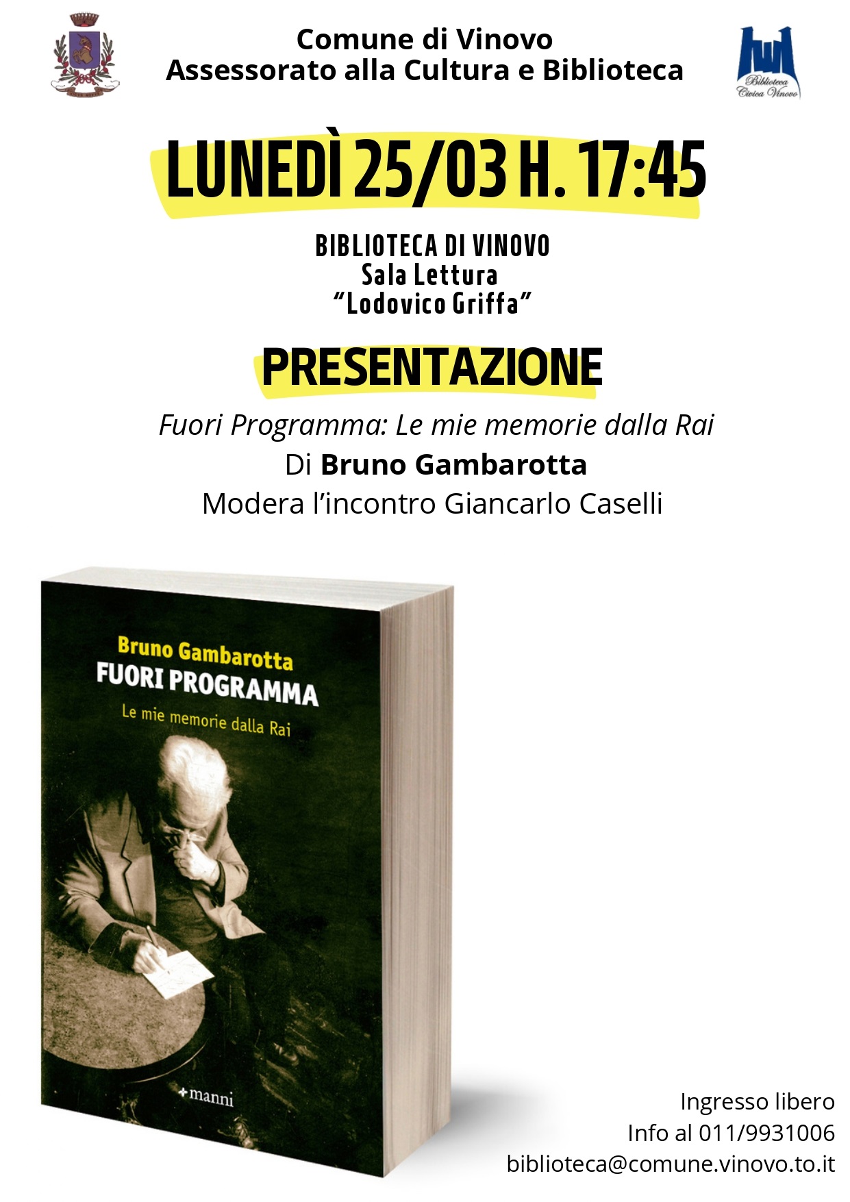 Il 25 marzo 2024 alle ore 17.45 Bruno Gambarotta presenta presso la Biblioteca Civica "Fuori Programma: Le mie memorie dalla Rai".