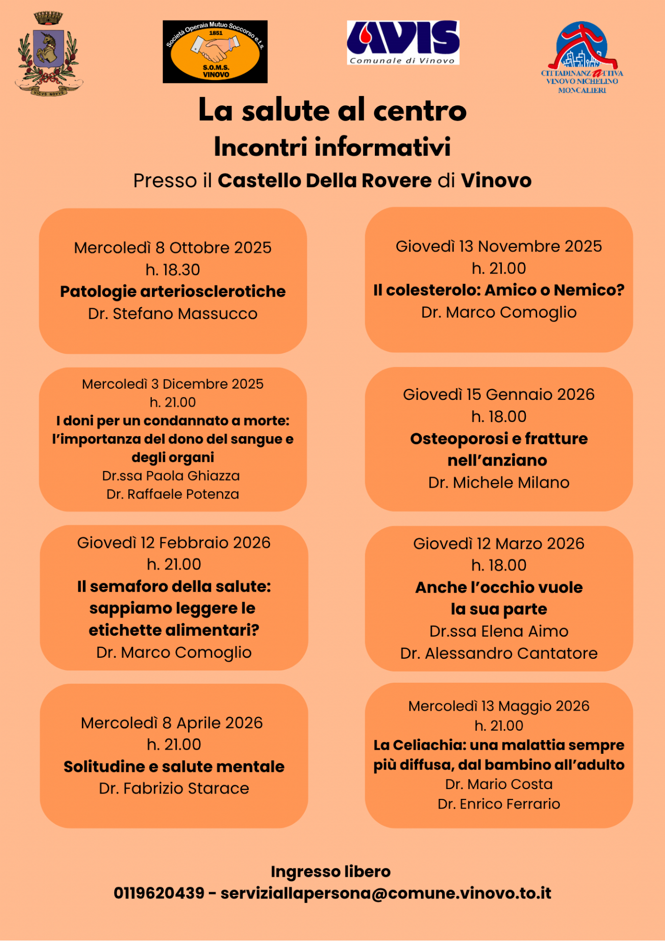 Le associazioni Soms Vinovo, Avis e Cittadinanzattiva, con la collaborazione del Comune, organizzano un ciclo di incontri informativi sulla salute.