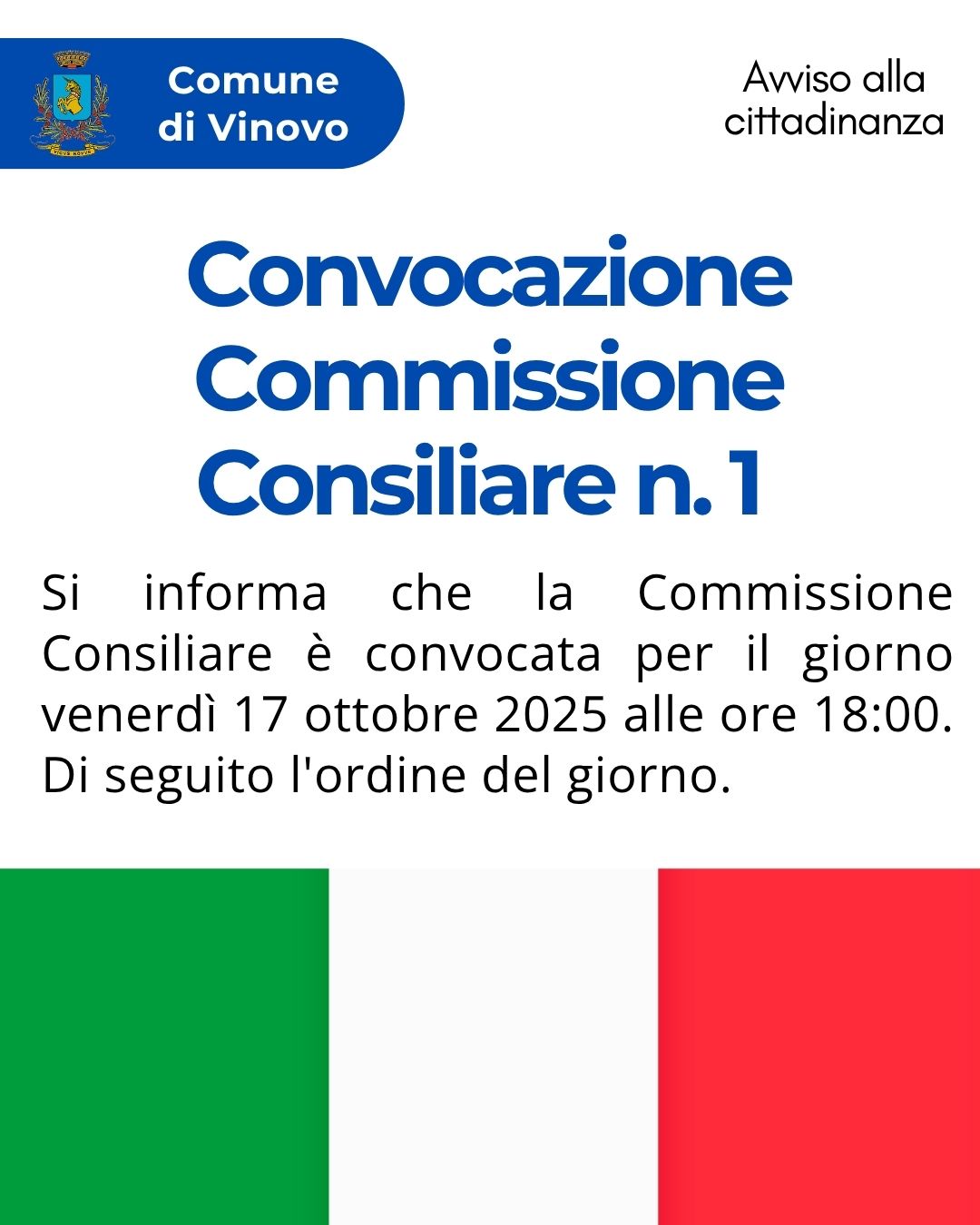 Si informa che è convocata la Commissione Consiliare n. 1 in data venerdì 17 ottobre 2025 alle ore 18:00. Di seguito l'ordine del giorno.