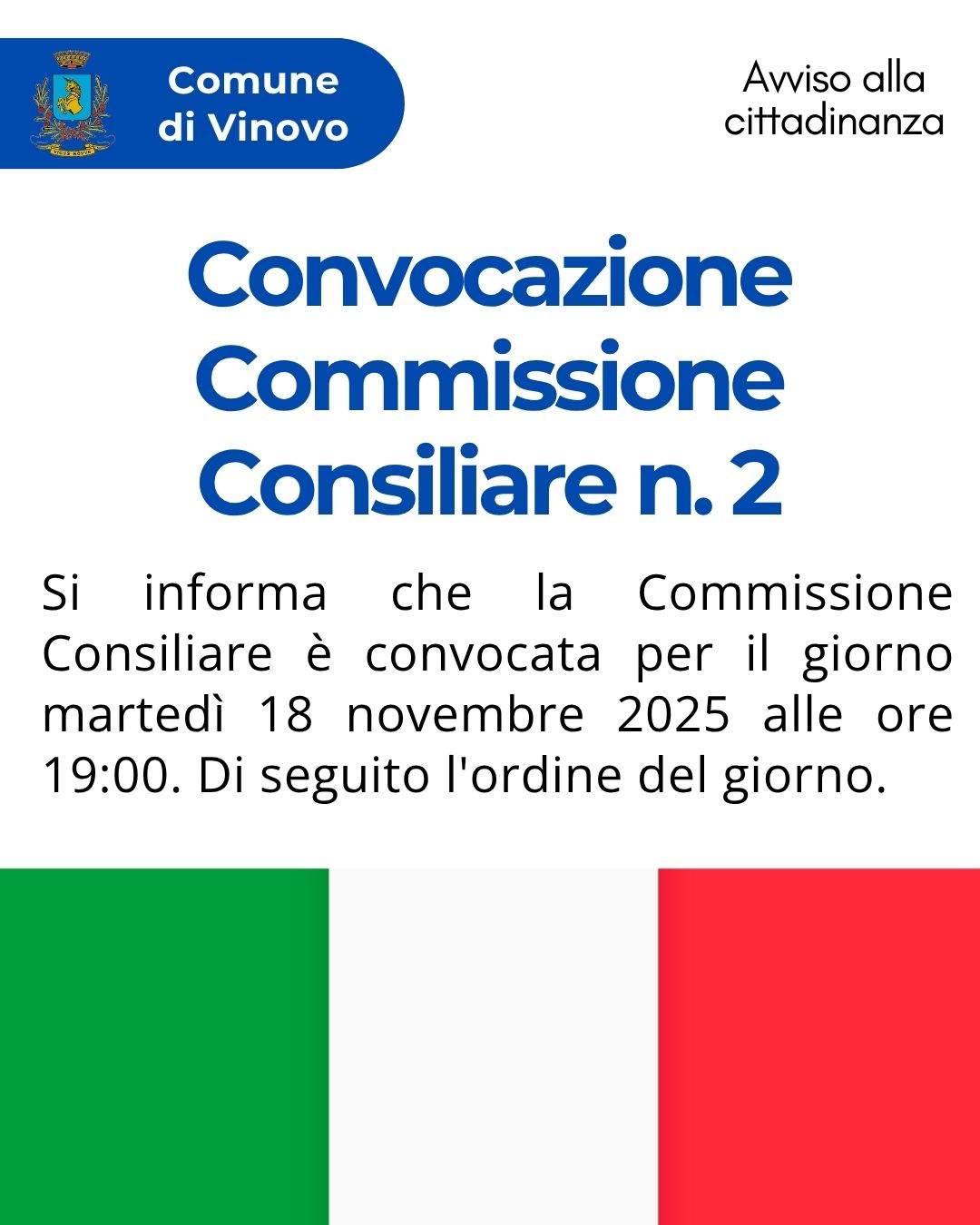 Si informa che è convocata la Commissione Consiliare n. 2 in data martedì 18 novembre 2025 alle ore 19:00. Di seguito l'ordine del giorno.
