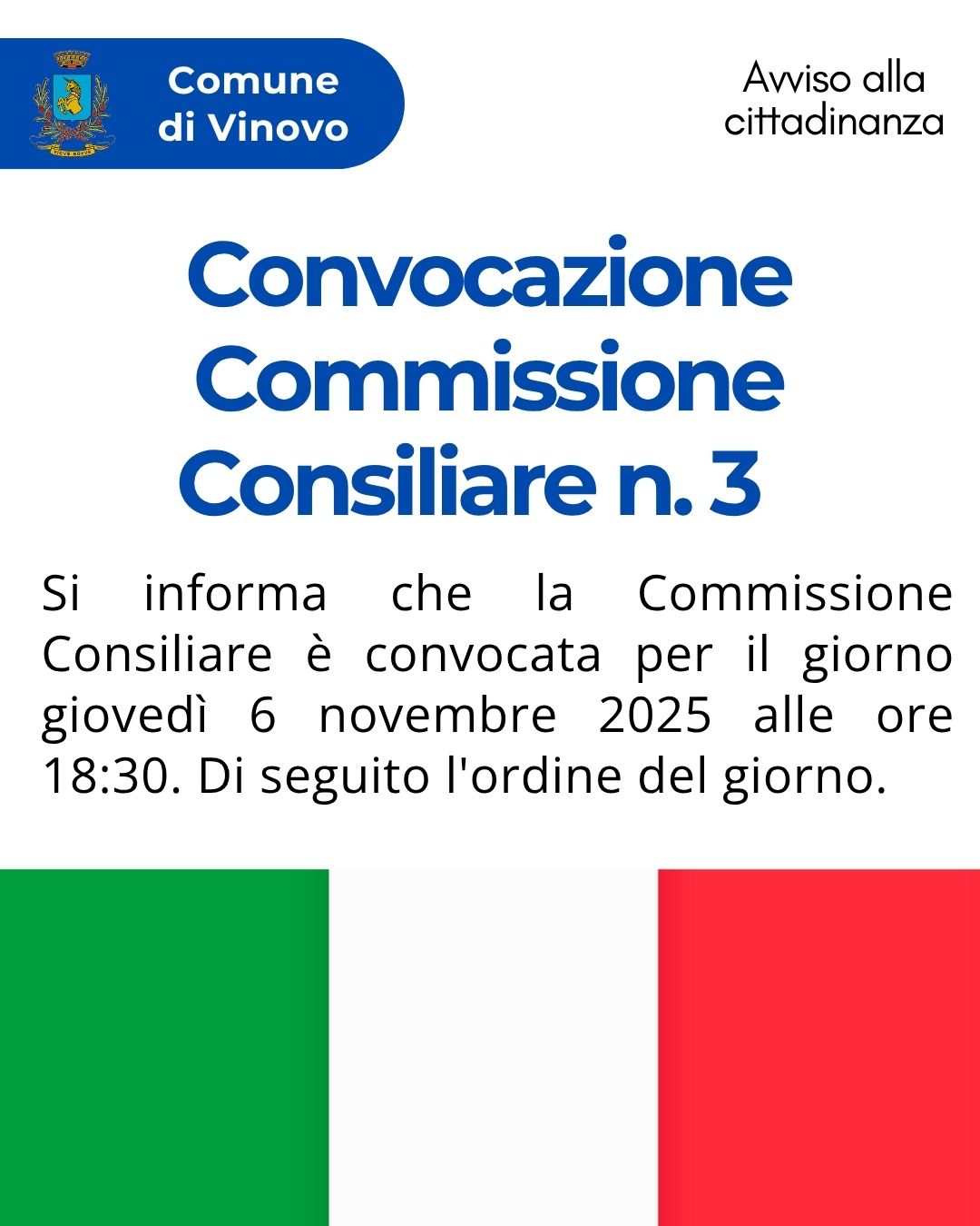 Si informa che è convocata la Commissione Consiliare n. 3 in data giovedì 6 novembre 2025 alle ore 18:30. Di seguito l'ordine del giorno.