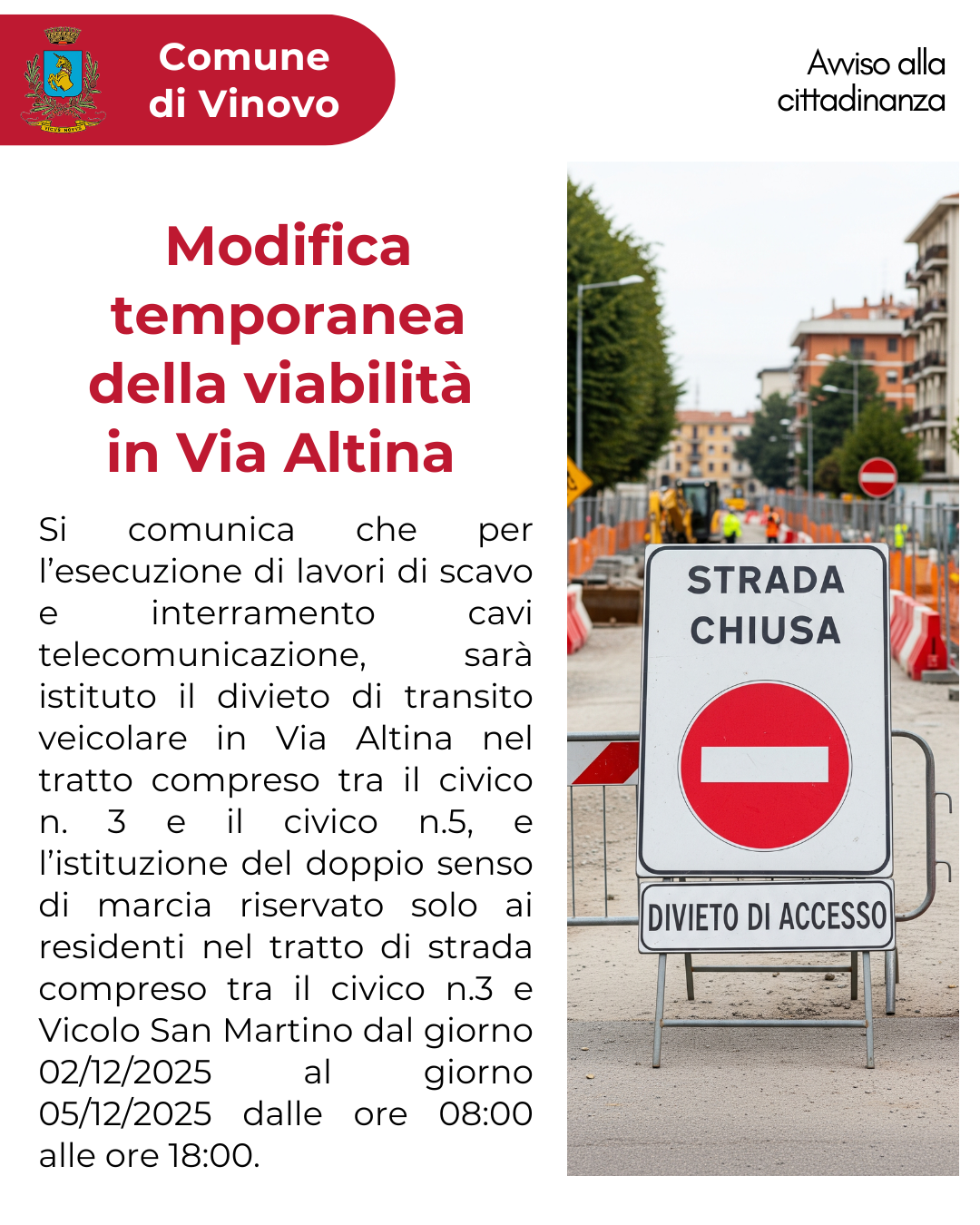 Si comunica che per l’esecuzione di lavori di scavo e interramento cavi telecomunicazione, sarà istituto il divieto di transito veicolare in Via Altina nel tratto compreso tra il civico n. 3 e il civico n.5, e l’istituzione del doppio senso di marcia riservato solo ai residenti nel tratto di strada compreso tra il civico n.3 e Vicolo San Martino dal giorno 02/12/2025 al giorno 05/12/2025 dalle ore 08:00 alle ore 18:00.