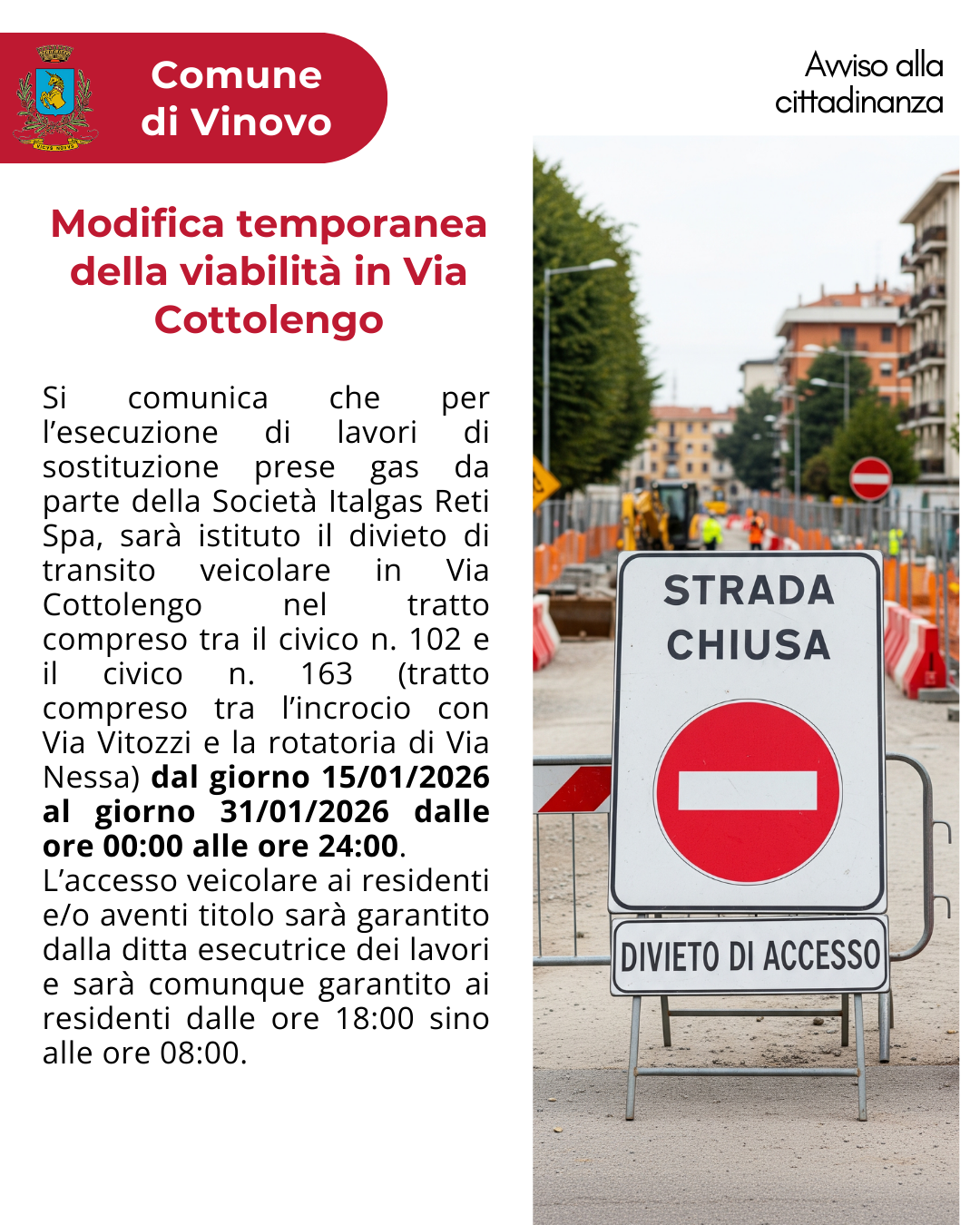 Si comunica che per l’esecuzione di lavori di sostituzione prese gas da parte della Società Italgas Reti Spa, sarà istituto il divieto di transito veicolare in Via Cottolengo nel tratto compreso tra il civico n. 102 e il civico n. 163 (tratto compreso tra l’incrocio con Via Vitozzi e la rotatoria di Via Nessa) dal giorno 15/01/2026 al giorno 31/01/2026 dalle ore 00:00 alle ore 24:00.